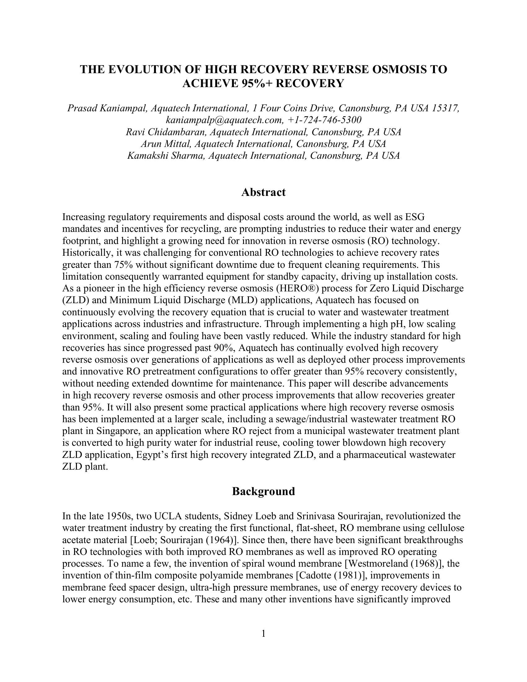 Increasing regulatory requirements and disposal costs around the world, as well as ESG mandates and incentives for recycling, are prompting industries to reduce their water and energy footprint, and highlight a growing need for innovation in reverse osmosis (RO) technology. Historically, it was challenging for conventional RO technologies to achieve recovery rates greater than 75% without significant downtime due to frequent cleaning requirements. This limitation consequently warranted equipment for standby capacity, driving up installation costs. As a pioneer in the high efficiency reverse osmosis (HEROÆ) process for Zero Liquid Discharge (ZLD) and Minimum Liquid Discharge (MLD) applications, Aquatech has focused on continuously evolving the recovery equation that is crucial to water and wastewater treatment applications across industries and infrastructure. Through implementing a high pH, low scaling environment, scaling and fouling have been vastly reduced. While the industry standard for high recoveries has since progressed past 90%, Aquatech has continually evolved high recovery reverse osmosis over generations of applications as well as deployed other process improvements and innovative RO pretreatment configurations to offer greater than 95% recovery consistently, without needing extended downtime for maintenance. This paper will describe advancements in high recovery reverse osmosis and other process improvements that allow recoveries greater than 95%. It will also present some practical applications where high recovery reverse osmosis has been implemented at a larger scale, including a sewage/industrial wastewater treatment RO plant in Singapore, an application where RO reject from a municipal wastewater treatment plant is converted to high purity water for industrial reuse, cooling tower blowdown high recovery ZLD application, Egyptís first high recovery integrated ZLD, and a pharmaceutical wastewater ZLD plant.