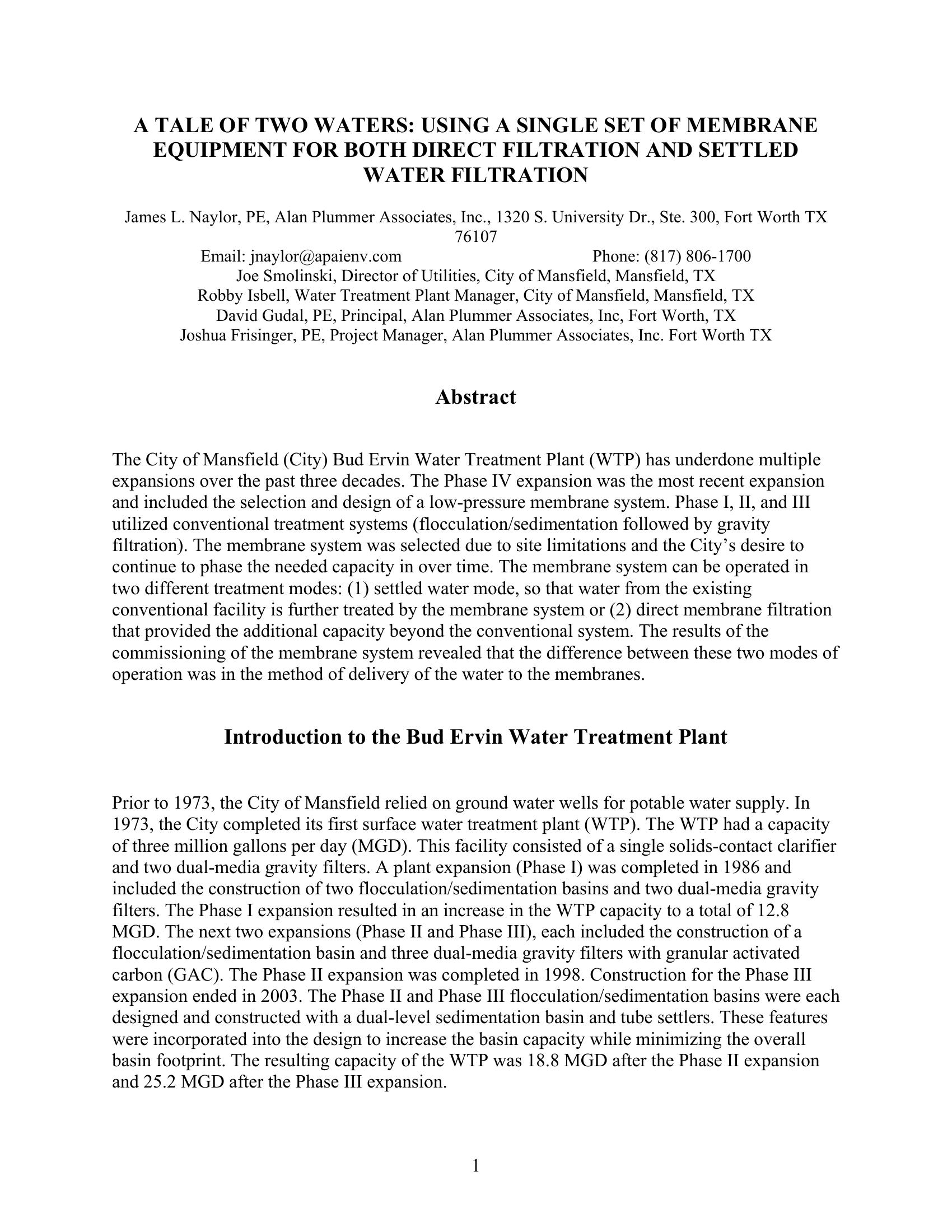 USING A SINGLE SET OF MEMBRANE EQUIPMENT FOR BOTH DIRECT FILTRATION AND SETTLED WATER FILTRATION. The City of Mansfield (City) Bud Ervin Water Treatment Plant (WTP) has underdone multiple expansions over the past three decades. The Phase IV expansion was the most recent expansion and included the selection and design of a low-pressure membrane system. Phase I, II, and III utilized conventional treatment systems (flocculation/sedimentation followed by gravity filtration). The membrane system was selected due to site limitations and the City?s desire to continue to phase the needed capacity in over time.