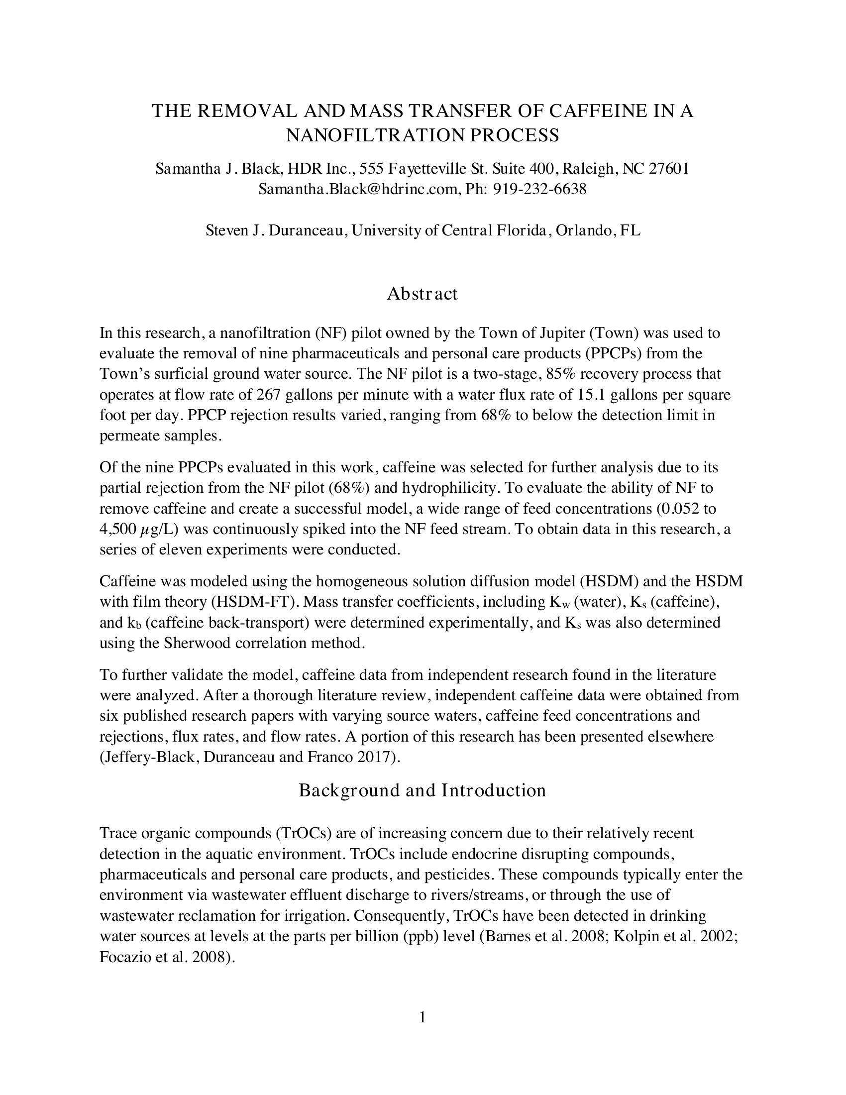 The abstract describes the methodology of how a mass transfer model of the anthropogenic wastewater contaminant, caffeine, was created and validated. It also presents a general description of the results of the project. This abstract should be added to the program because it provides valuable insight regarding the transport of caffeine through a nanofiltration pilot. Also, model development methods described in this work can be applied to other constituents.