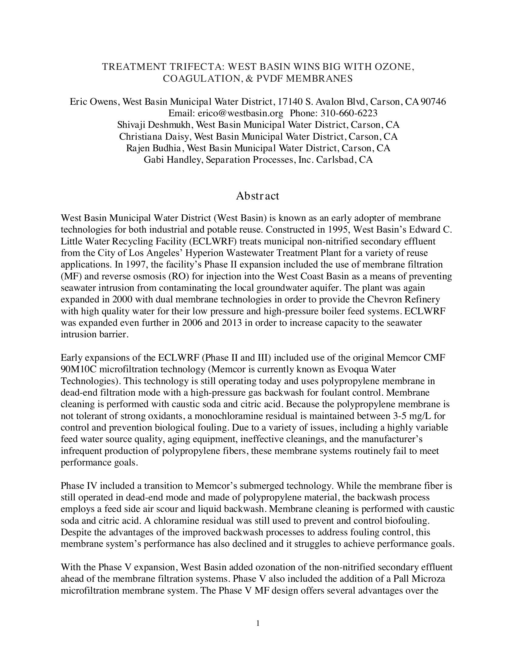 West Basin Municipal Water District (West Basin) is known as an early adopter of membrane technologies for both industrial and potable reuse. West Basin has experienced severe fouling of its MF membrane in recent years as a result of feed water quality changes, aging infrastructure, and obsolete treatment technologies. In response to years of deteriorating MF performance resulting in reduced capacities and increased O&M costs, the Phase V expansion took advantage of several factors, including ozone as pretreatment to MF, PVDF MF membrane, and a conservative design based on rigorous piloting and the membrane manufacturer?s years of experience in this application. As a result, the Phase V expansion design demonstrates that no water is too difficult to treat, so long as the right technologies and treatment processes are in place.
