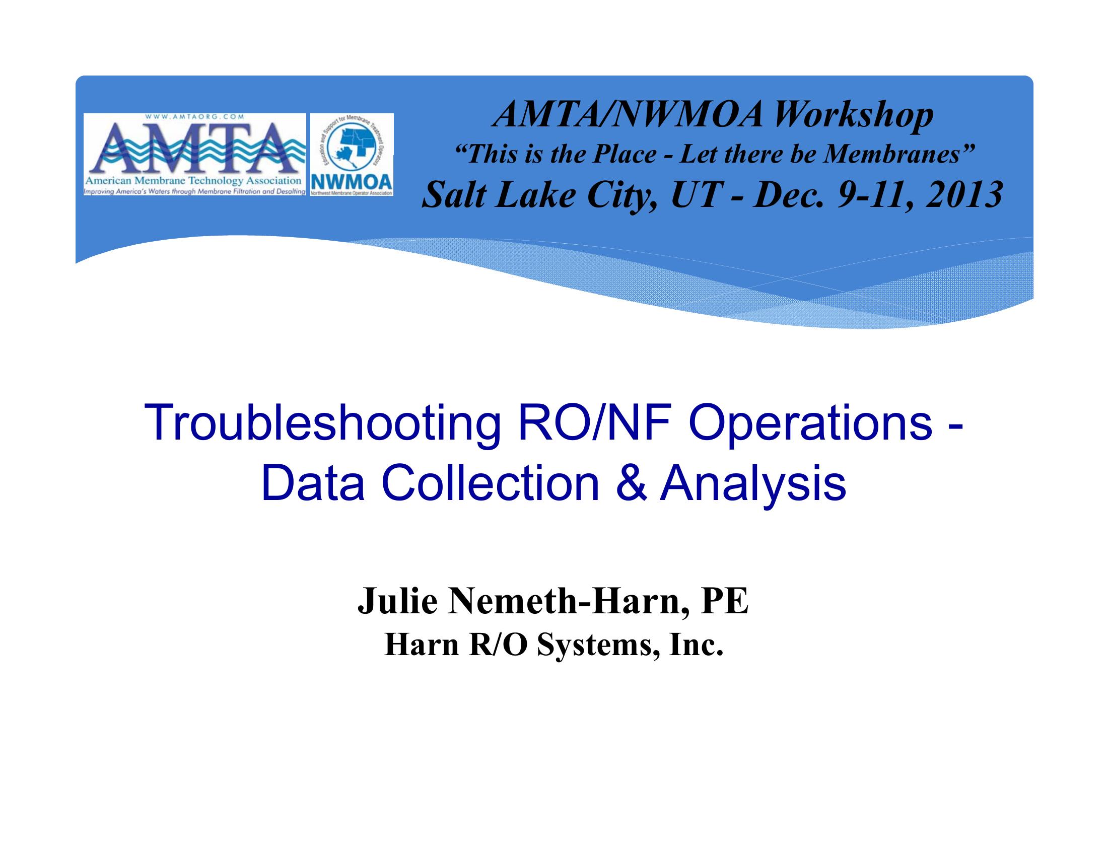 This presentation provides information on data collection and analysis for reverse osmosis (RO) and nanofiltration (NF) systems. The presentation begins with a discussion of RO/NF process basics. Data normalization is then discussed followed by graphical illustrations showing how flow, pressure, and salt concentration vary through a low pressure RO system (LPRO). The presentation concludes with troubleshooting and routine maintenance recommendations.