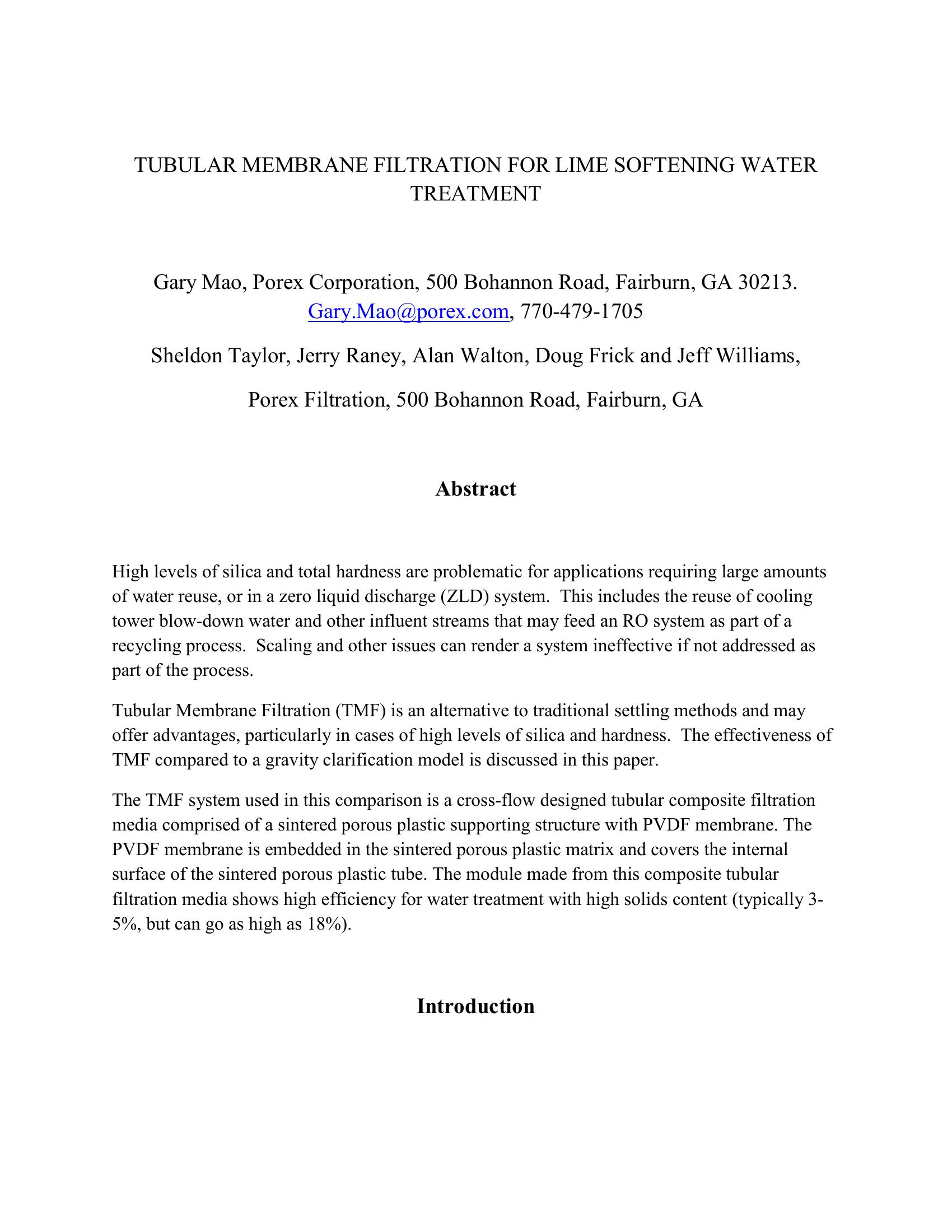 This paper describes the use of tubular membrane filtration (TMF) as an alternative to traditional settling methods that may offer advantages, particularly in cases of high levels of silica and hardness. The effectiveness of TMF compared to a gravity clarification model is discussed in this paper. The TMF system used in this comparison was a cross-flow designed tubular composite filtration media comprised of a sintered porous plastic supporting structure with PVDF membrane.