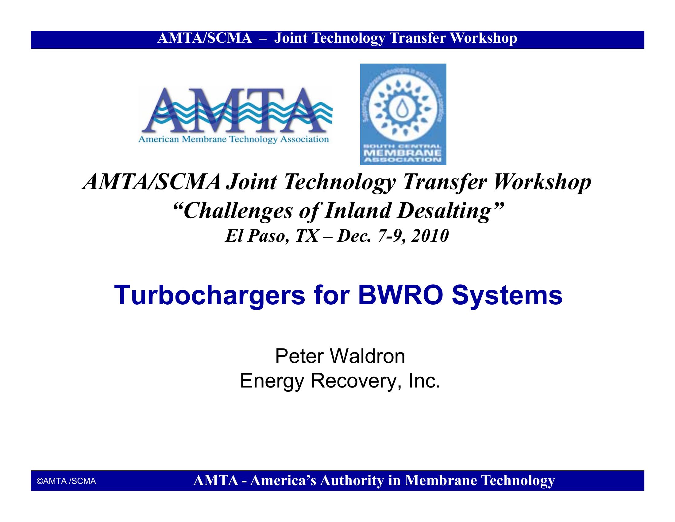Energy recovery systems for brackish reverse osmosis (RO) plants. Advantages of energy recover in improving energy efficiency and balancing membrane flux between 1st and 2nd stages. Discussion of turbochargers and Isobaric energy recovery devises.