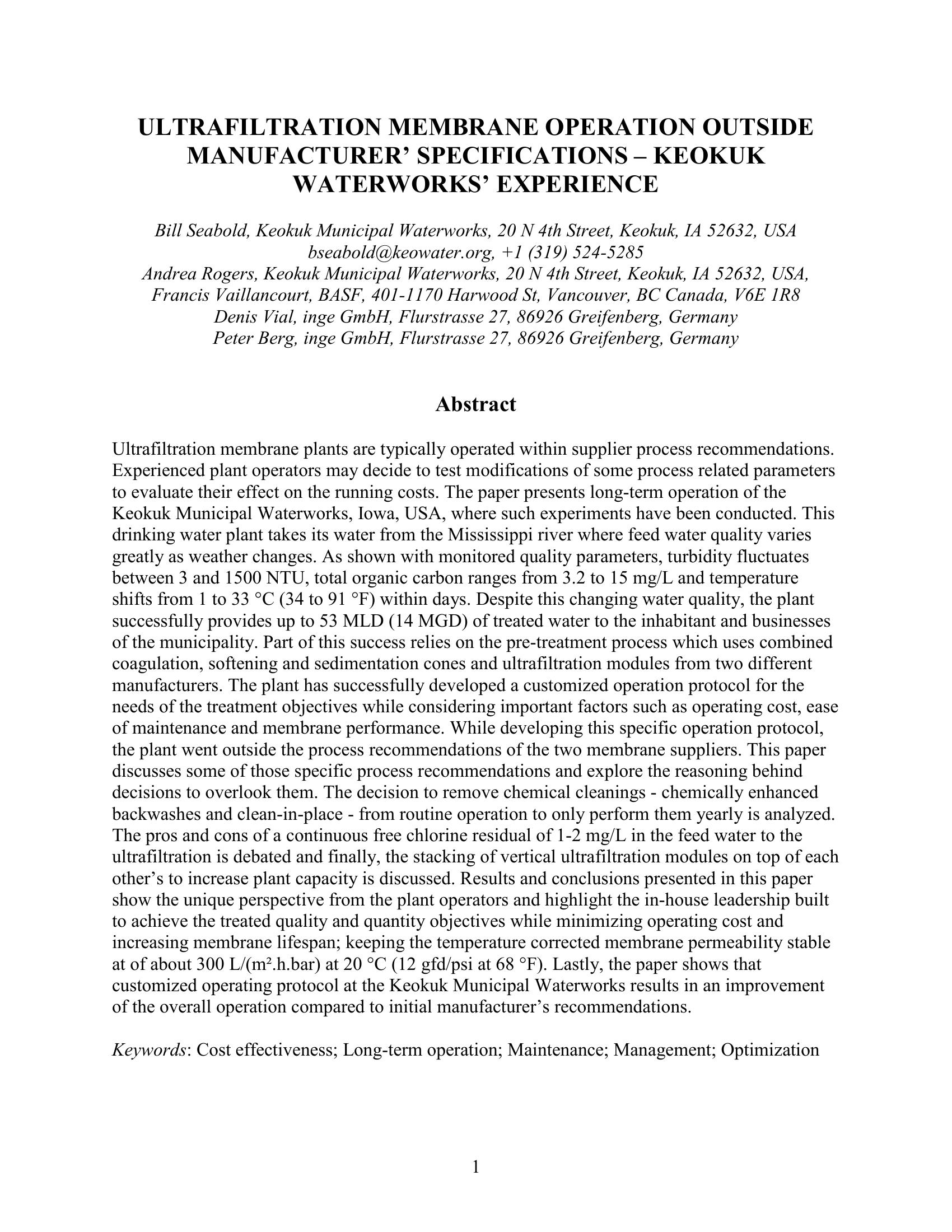 Ultrafiltration Membrane Operation Outside Manufacturer?s Specifications – Keokuk Waterworks? experience