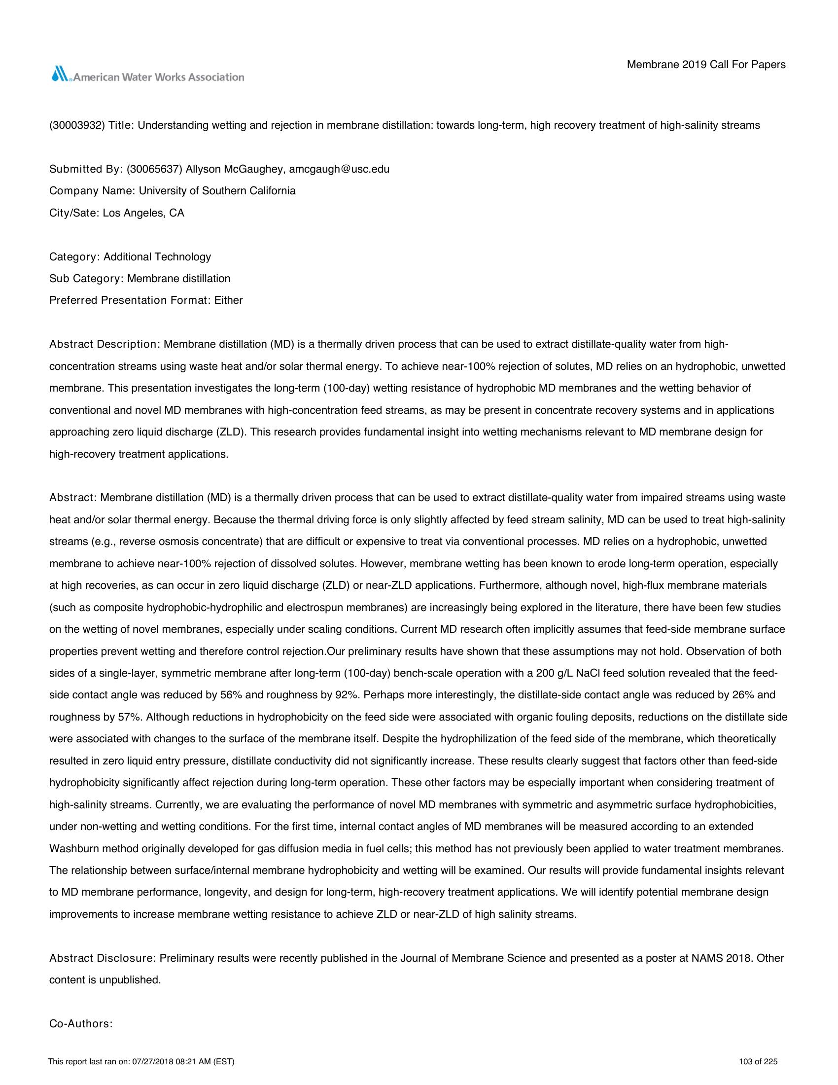Membrane distillation (MD) is a thermally driven process that can be used to extract distillate-quality water from highconcentration streams using waste heat and/or solar thermal energy. To achieve near-100% rejection of solutes, MD relies on an hydrophobic, unwetted membrane. This presentation investigates the long-term (100-day) wetting resistance of hydrophobic MD membranes and the wetting behavior of conventional and novel MD membranes with high-concentration feed streams, as may be present in concentrate recovery systems and in applications approaching zero liquid discharge (ZLD). This research provides fundamental insight into wetting mechanisms relevant to MD membrane design for high-recovery treatment applications.