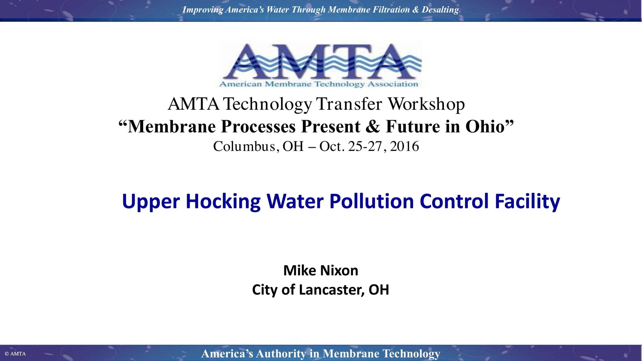 This presentation provides an overview for the selection, design, implementation and operations of Upper Hocking WWTP. The rationale for selecting the MBR process will be reviewed, answering the “why MBR?” The design and implementation covers construction cost and start-up lessons learned. The operations section highlights operating data since start-up and highlights O&M practices the City of Lancaster has implemented.