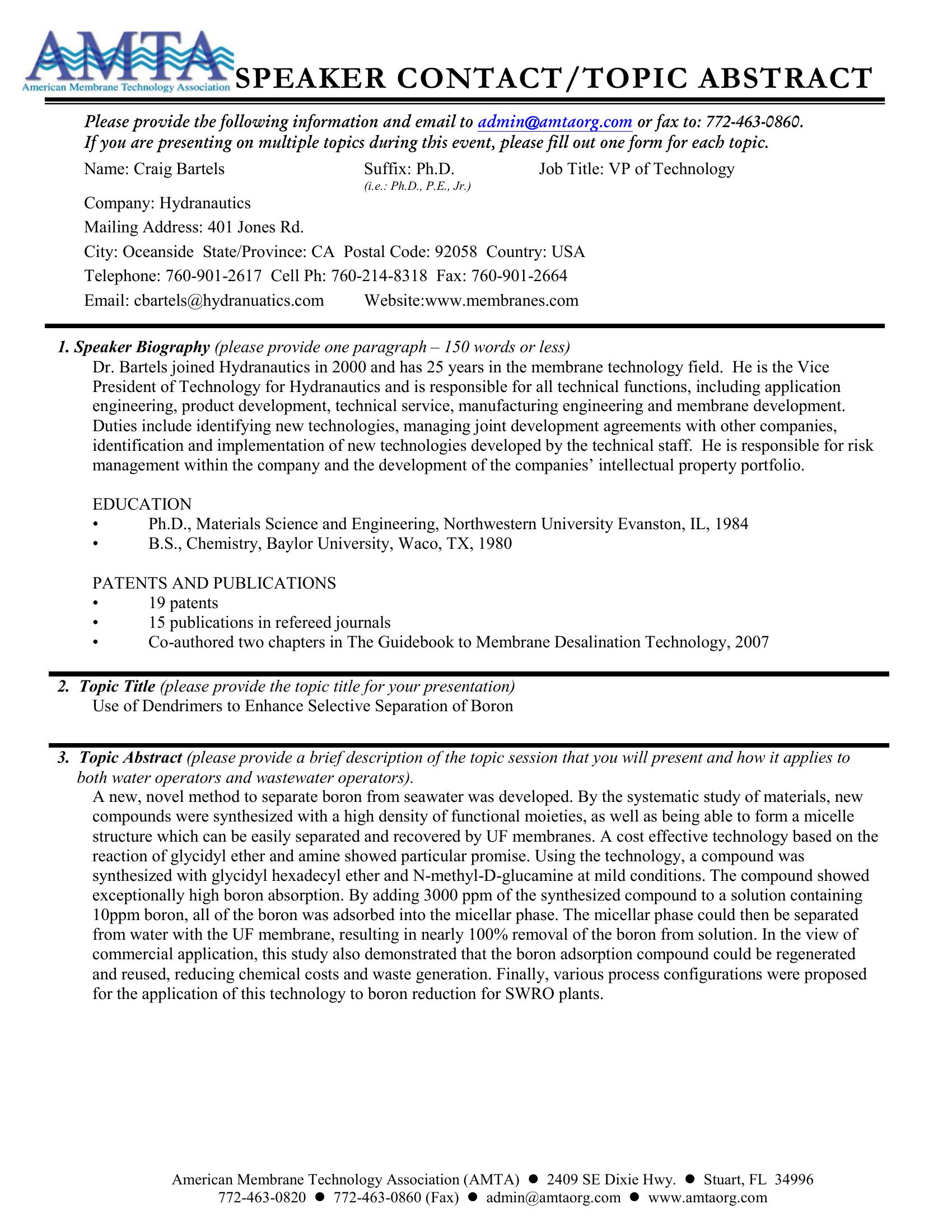 Use of Dendrimers to Enhance Selective Separation of Boron with Nanofiltration and Reverse Osmosis Membranes