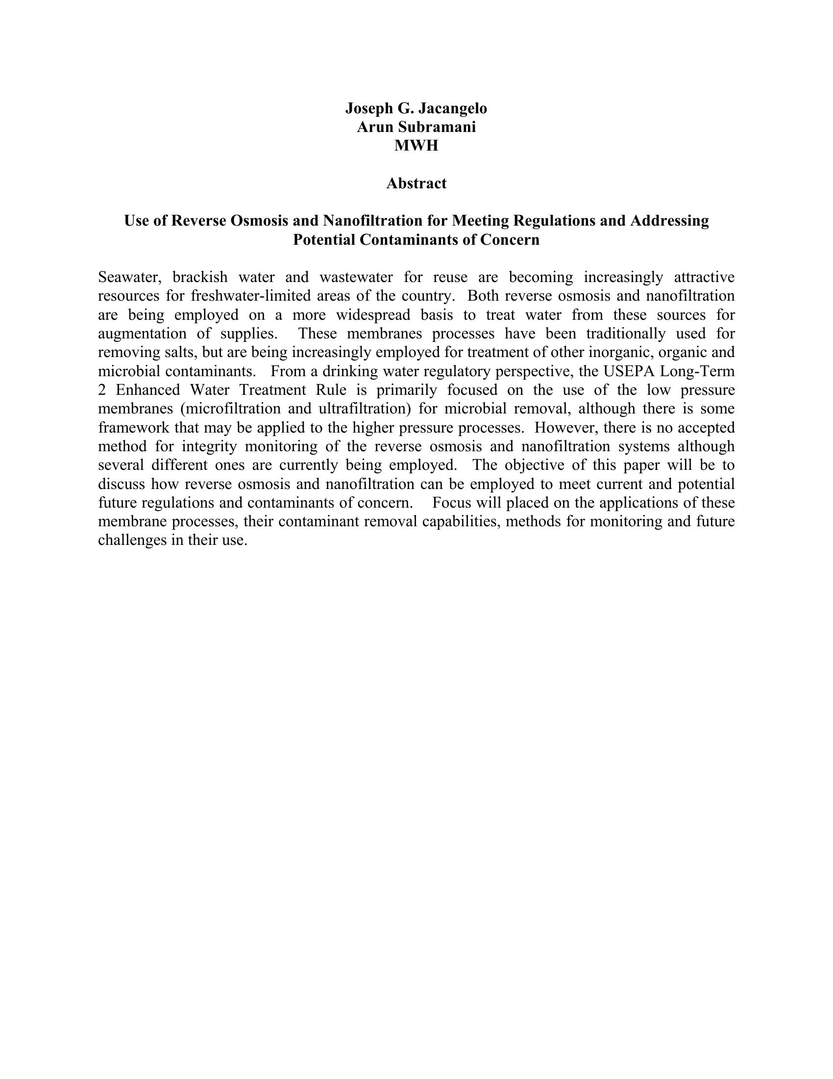 Use of Reverse Osmosis and Nanofiltration for Meeting Regulations and Addressing Potential Contaminants of Concern.