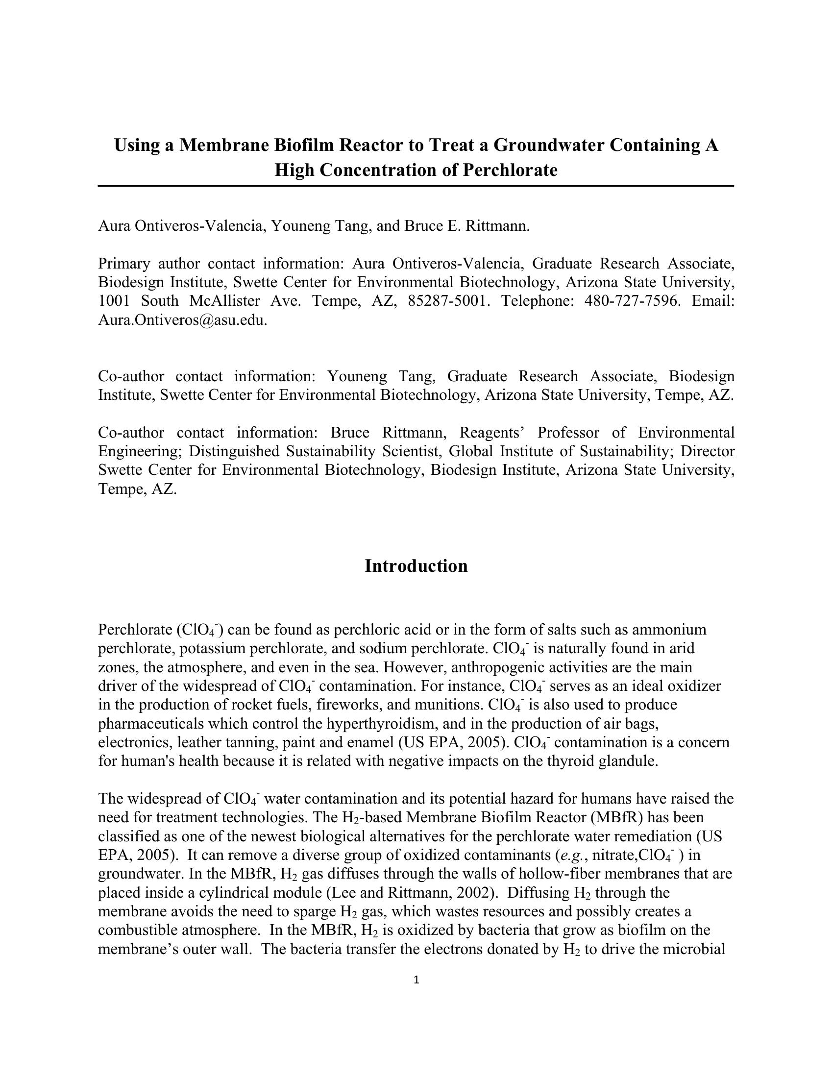 This paper examines the use of a membrane biofilm reactor (MBfR) to remove perchlorate in a groundwater from ~10 mg/L to below the Arizona clean-up level of 14 Êg/L. Results provided indicate that a two stage MBfR is needed to reach the Arizona target concentration because of sulfate reduction