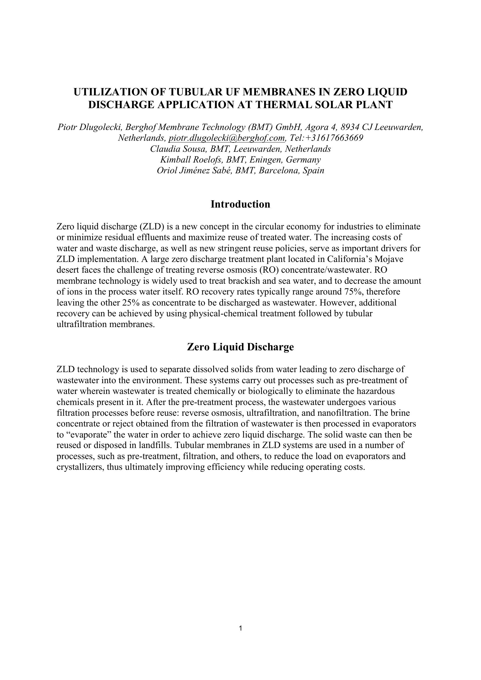 Utilization of Tubular UF Membranes in Zero Liquid Discharge Application at Thermal Solar Plant