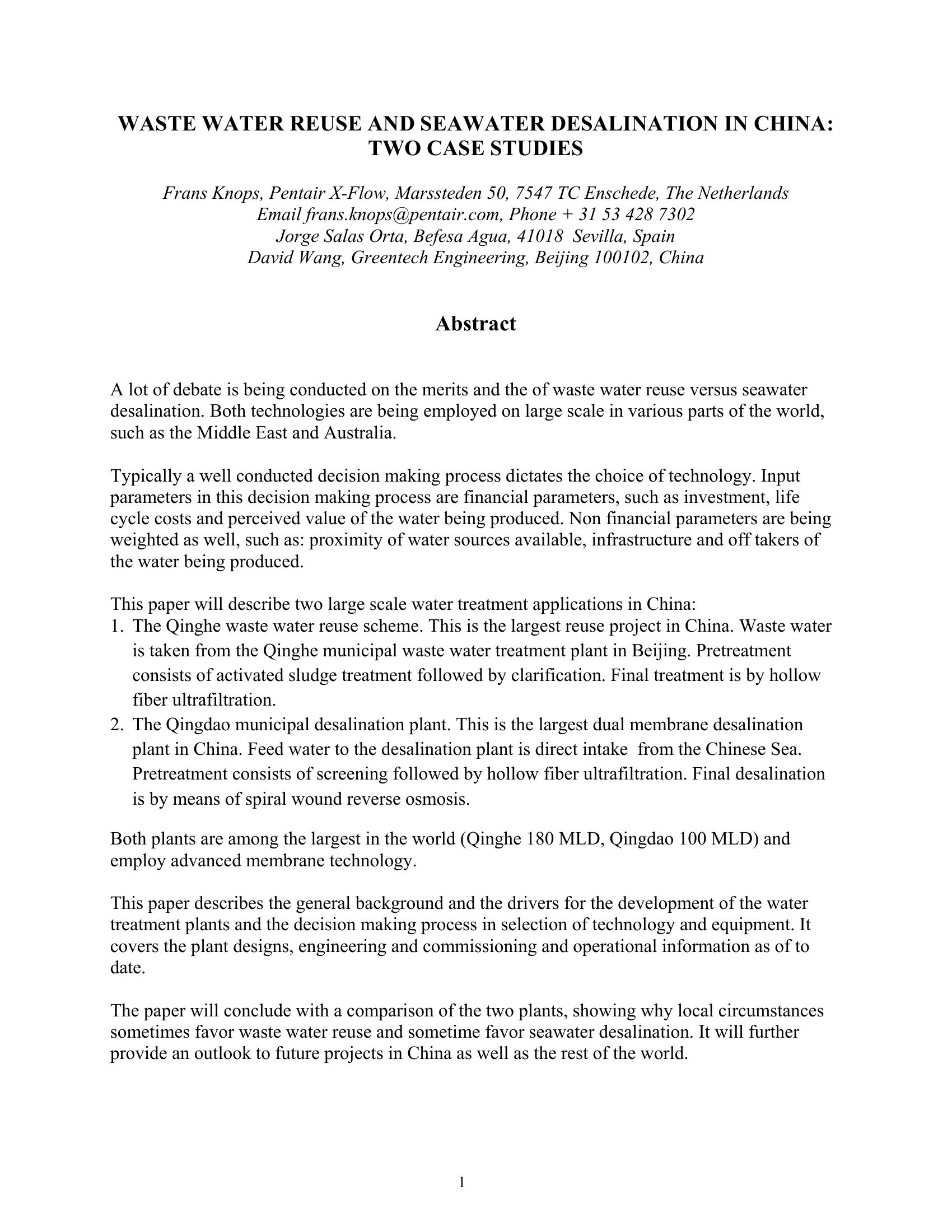 This paper describes two large scale membrane treatment applications in China which focus on seawater desalination and reuse schemes. It covers plant design, engineering, and operational information of the two plants and shows why local circumstances sometimes favor waste water reuse and sometime favor seawater desalination.