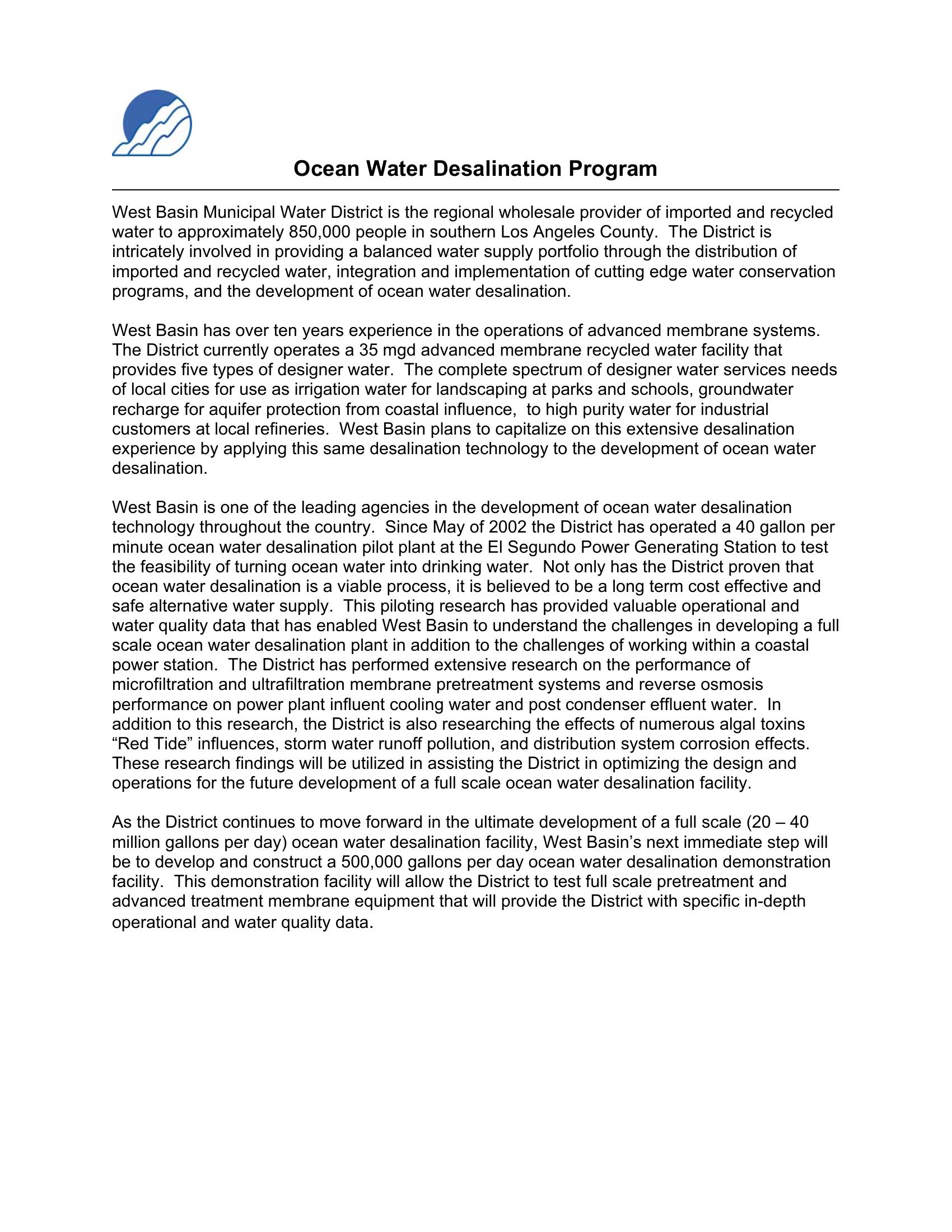 West Basin Municipal Water District, California (which is located in southern Los Angeles County) is planning to construct a 0.5 MGD ocean/seawater reverse osmosis (RO) desalination demonstration facility as part of planning/preparing to ultimately develop a 20 to 40 MGD RO desalination facility to augment other water sources including their existing advanced recycled water facilities with 35 MGD of capacity.
