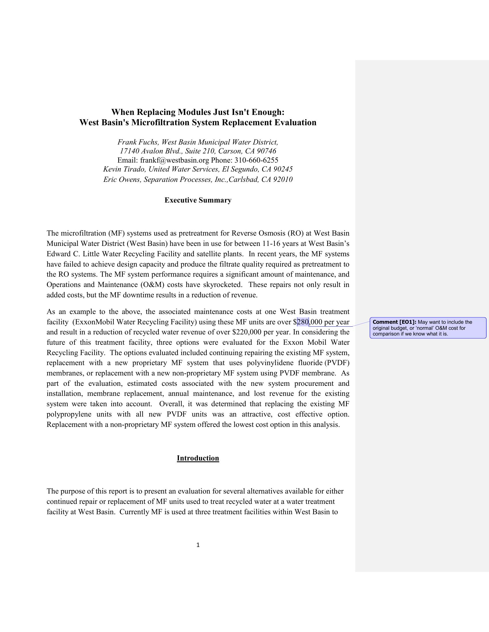 The purpose of this paper is to document the performance and integrity issues experienced at this facility and present a preliminary cost comparison to either repair or replace the Memcor 90M10C micro filtration (MF) units at the West Basin ExxonMobil Water Recycling Facility. Three options were evaluated; 1) continue repairing the existing MF system, 2) replacement with new proprietary MF systems that use polyvinylidene fluoride (PVDF) membranes, or 3) replacement with a non-proprietary MF system that can adapt a variety of manufacturer’s PVDF membrane modules. As part of the evaluation, the estimated installation cost, membrane life, yearly maintenance costs, and lost revenue were taken into account. Overall, the most cost effective solutions for the District appear to be to replace the 6 existing Memcor 9010MC units with either a proprietary or non-proprietary PVDF MF system design.