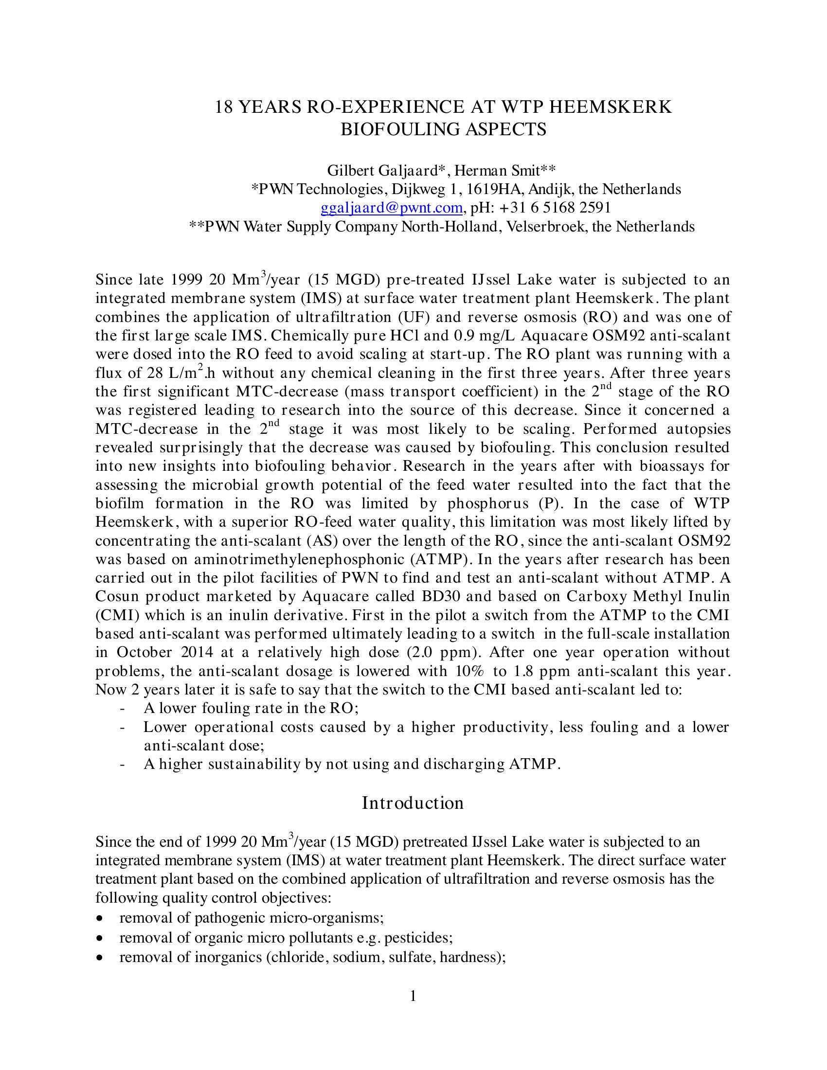 18 Years RO-Experience at WTP Heemskerk Biofouling Aspects