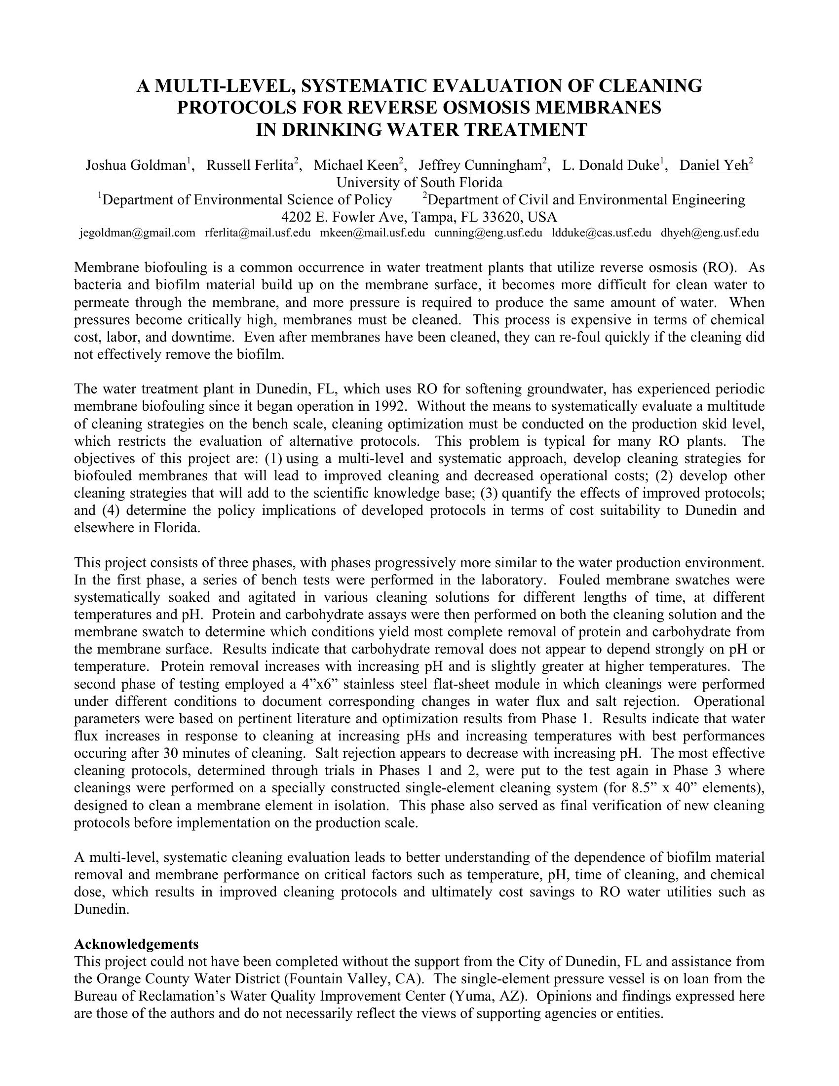 | Keywords | Dunedin FL, reverse osmosi, biofouling |