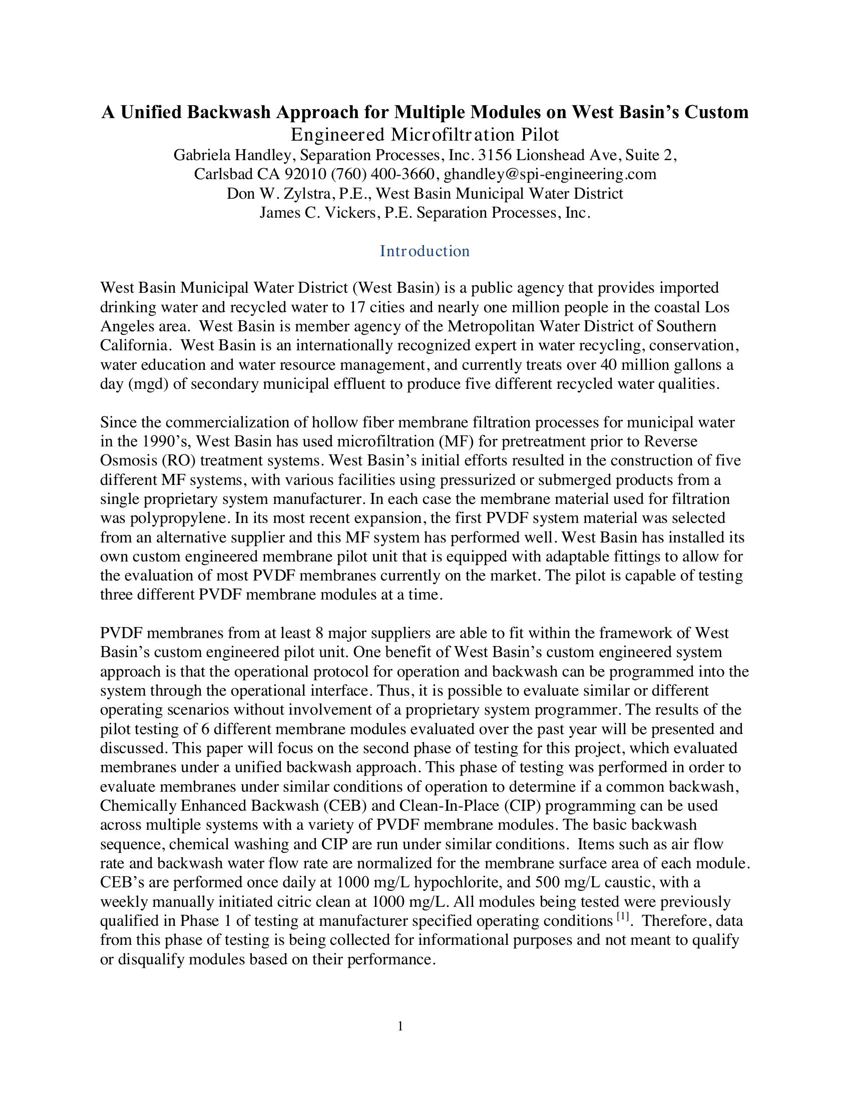 A Unified Backwash Approach for Multiple Modules on West Basin?s Custom Engineered Microfiltration Pilot