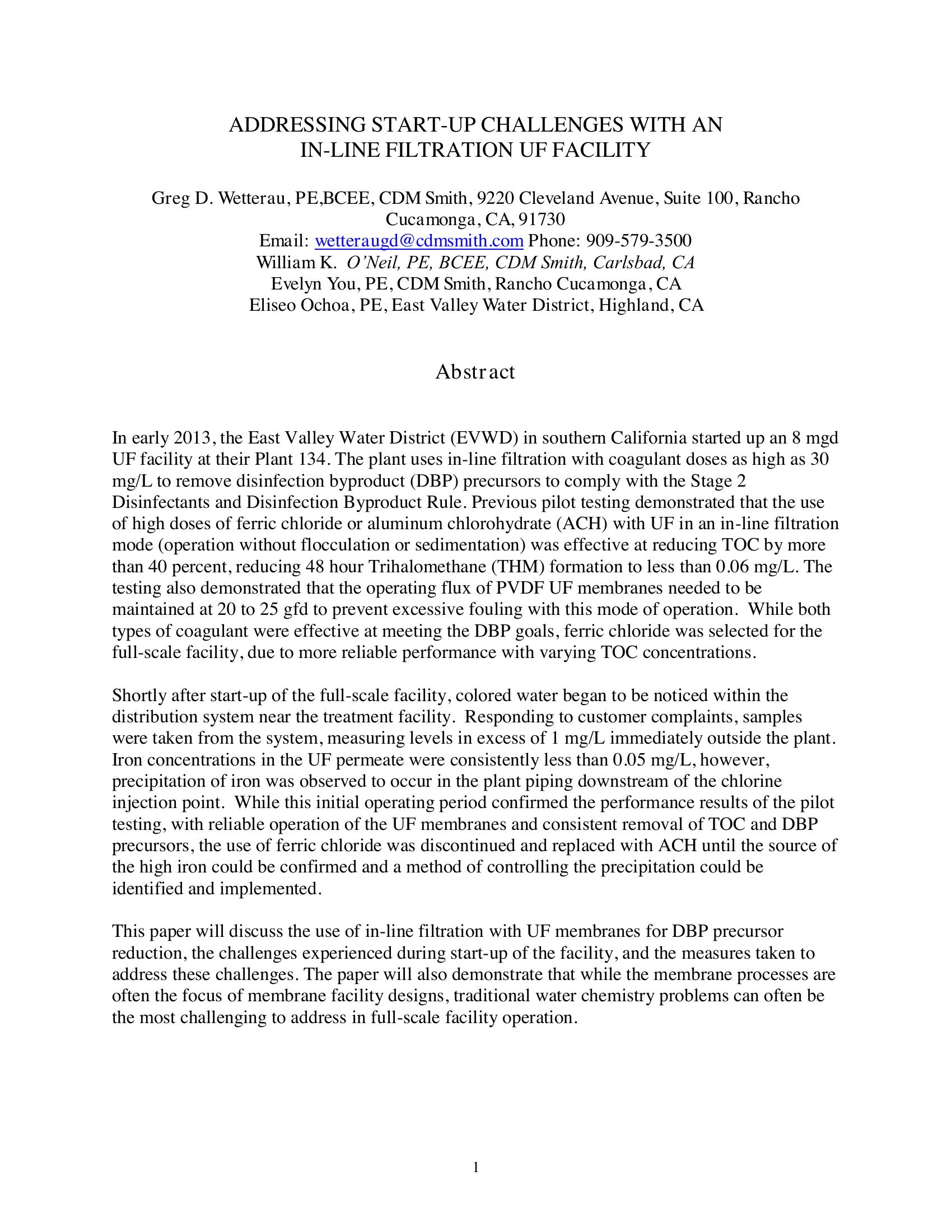 This paper discusses the use of in-line filtration with ultrafiltration (UF) membranes for disinfection by-product (DBP) precursor reduction, the challenges experienced during start-up of the facility, and the measures taken to address these challenges. The paper also demonstrates that while the membrane processes are often the focus of membrane facility designs, traditional water chemistry problems can often be the most challenging to address in full-scale facility operation.