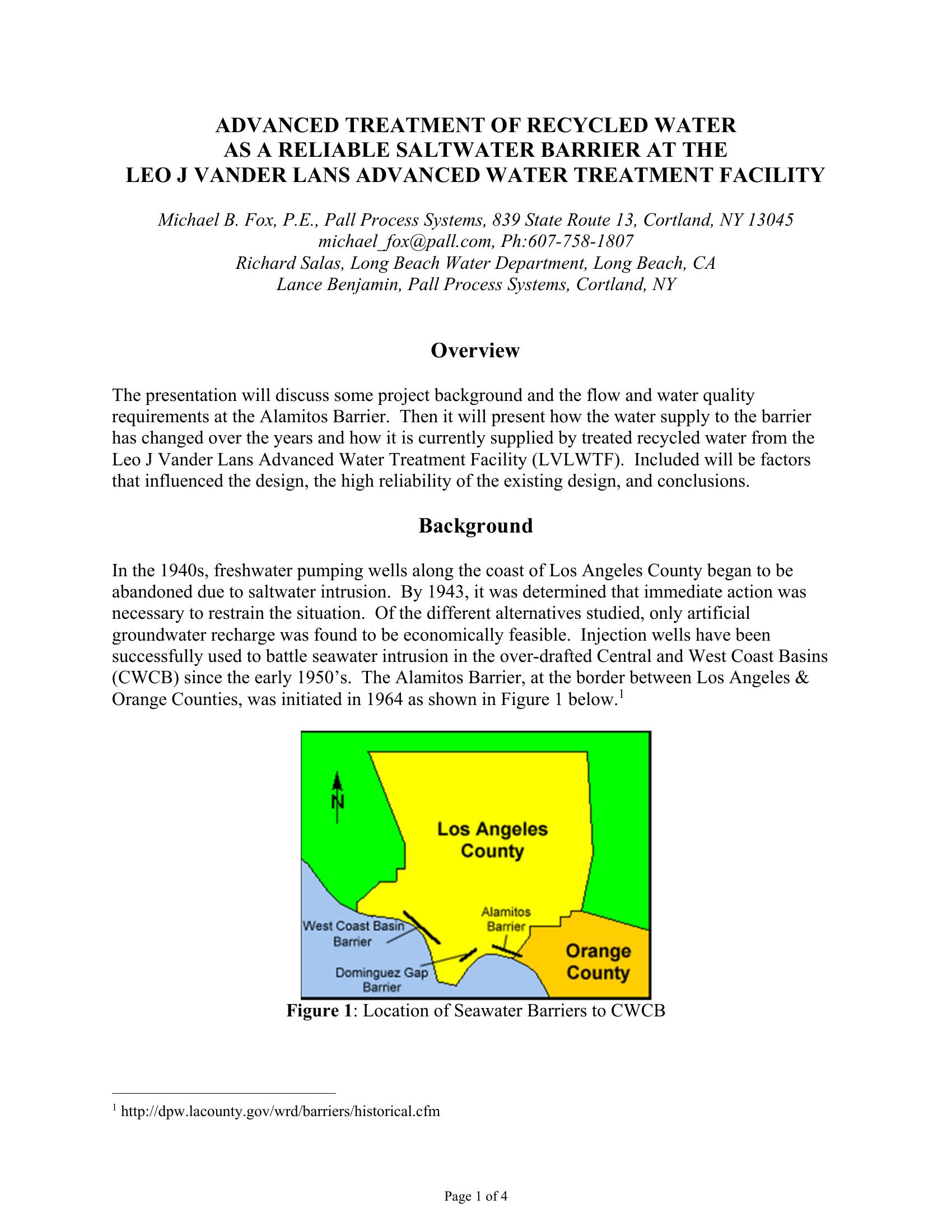 Advanced Treatment of Recycled Water as a Reliable Saltwater Barrier at the Leo J Vander Lans Advanced Water Treatment Facility