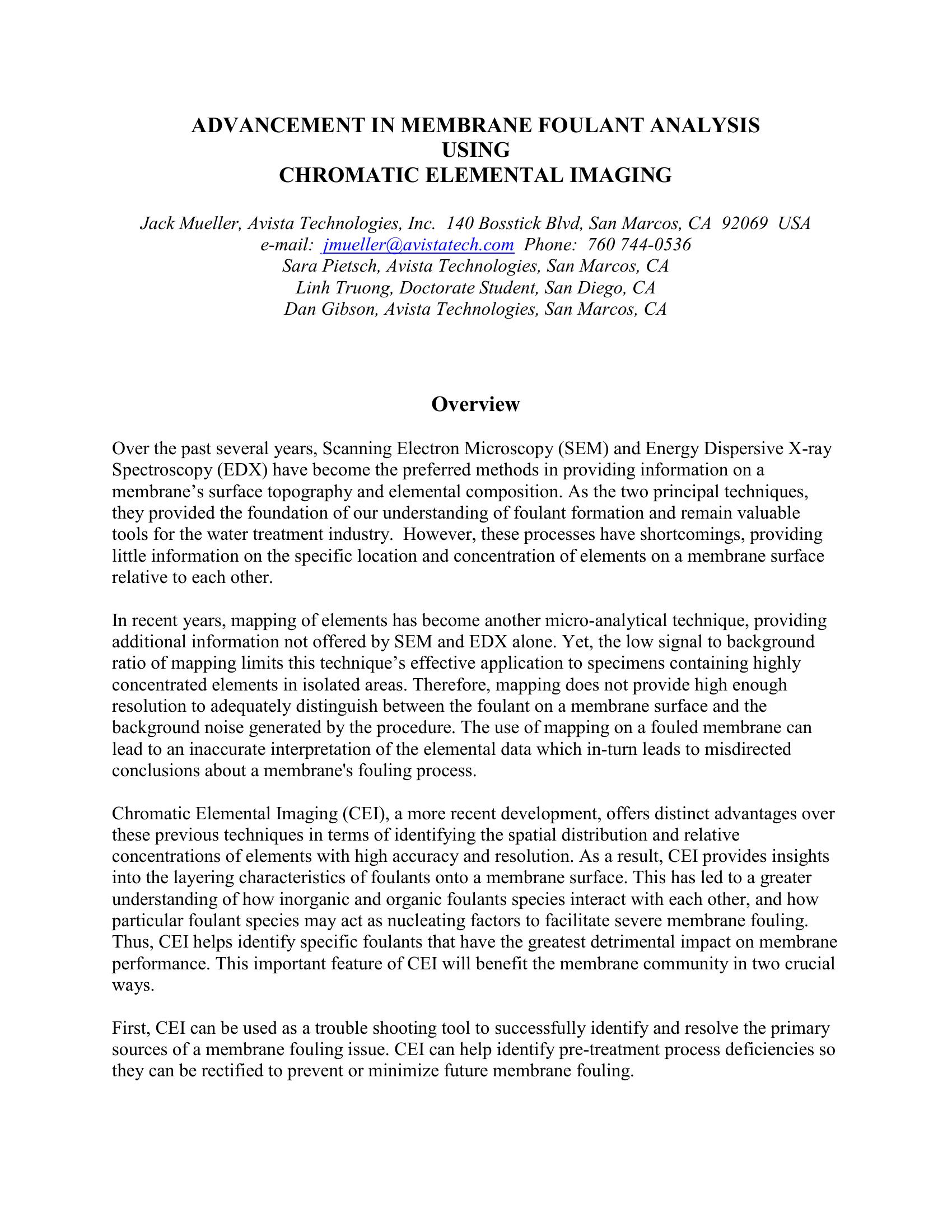 This paper discusses Chromatic Elemental Imaging (CEI) as it relates to identifying the spatial distribution and relative concentrations of elements with high accuracy and resolution for membrane separation and filtration technologies. Discussed are the benefits of the technology and a comparison to Element Mapping (EM), Scanning Electron Microscopy (SEM) and Energy Dispersive X-ray Spectroscopy (EDX) all of which only represent limited results when used separately.