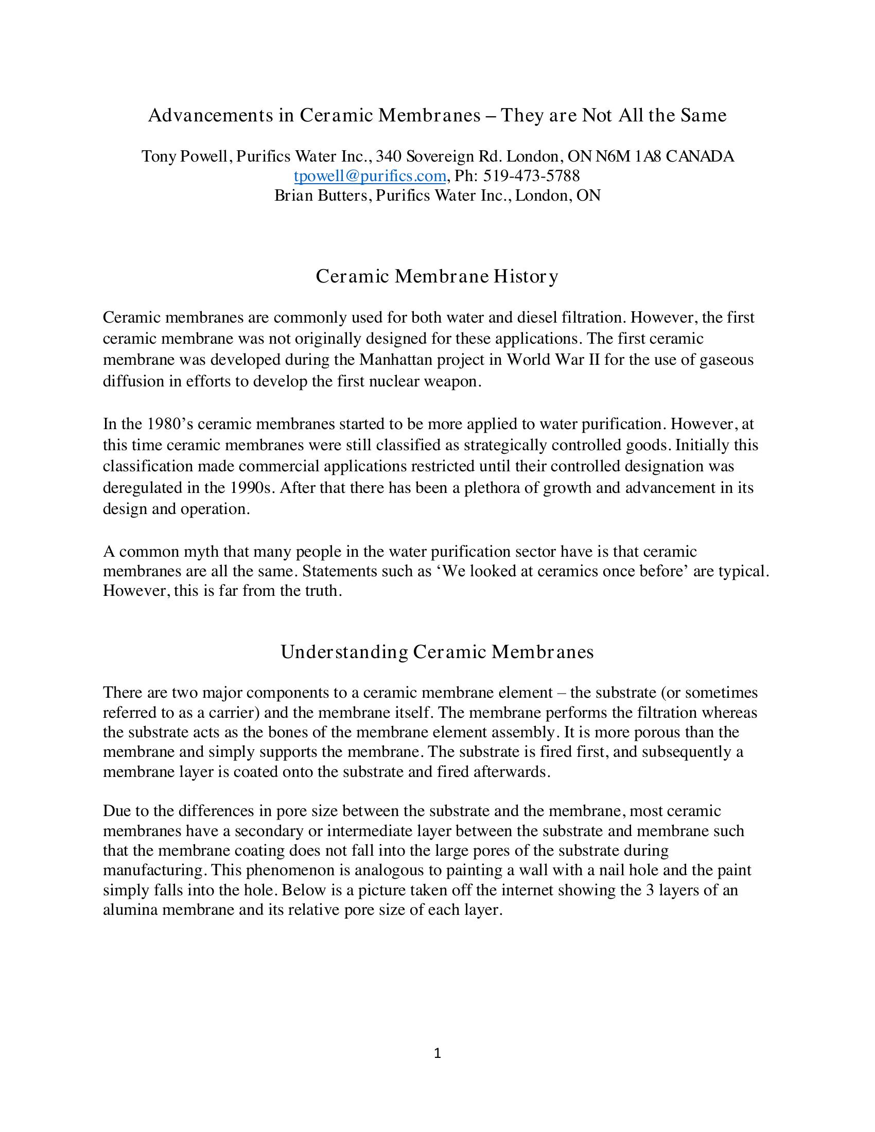 Ceramic membranes are commonly used for both water and diesel filtration. However, the first ceramic membrane was not originally designed for these applications. The first ceramic membrane was developed during the Manhattan project in World War II for the use of gaseous diffusion in efforts to develop the first nuclear weapon. In the 1980ís ceramic membranes started to be more applied to water purification. However, at this time ceramic membranes were still classified as strategically controlled goods. Initially this classification made commercial applications restricted until their controlled designation was deregulated in the 1990s. After that there has been a plethora of growth and advancement in its design and operation. A common myth that many people in the water purification sector have is that ceramic membranes are all the same. Statements such as ëWe looked at ceramics once beforeí are typical. However, this is far from the truth.