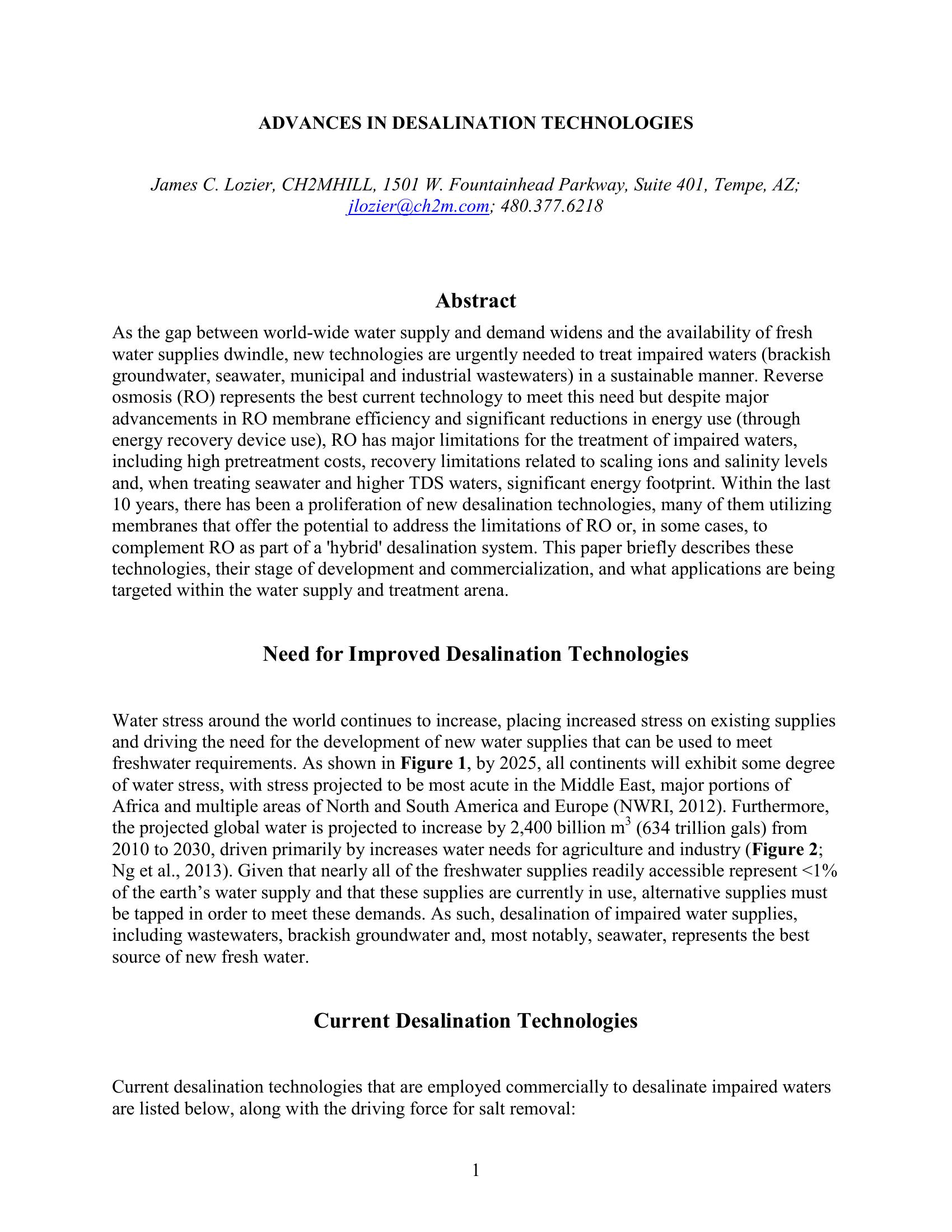 As the gap between world-wide water supply and demand widens and the availability of fresh water supplies dwindle, neew technologies are urgently needed to treat impaired waters in a sustainable manner. RO represents the best current tecchnology to meet this need but dispite major advancements in RO membrane efficiency and significant reducations in energy use, RO has major limitations for the treatment of impaired waters, including high pretreatment costs, recovery limitations related to scaling ions and salinity levels, and when treating seawater and higher TDS water, significant energy footprint. Drawing on a wide rande of sources, this paper describes innovative technologies, provide insight into the stae of their development, and discuss where each may be best applied within the desalination market.
