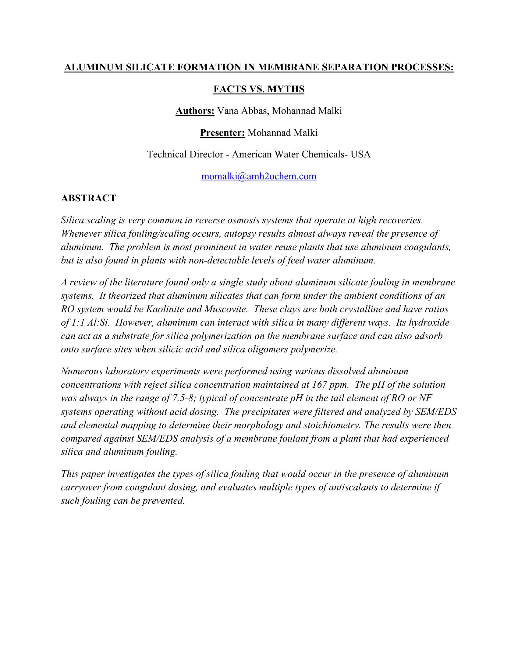 | Keywords | Reverse Osmosis, Antiscalants, Aluminum Silicate |