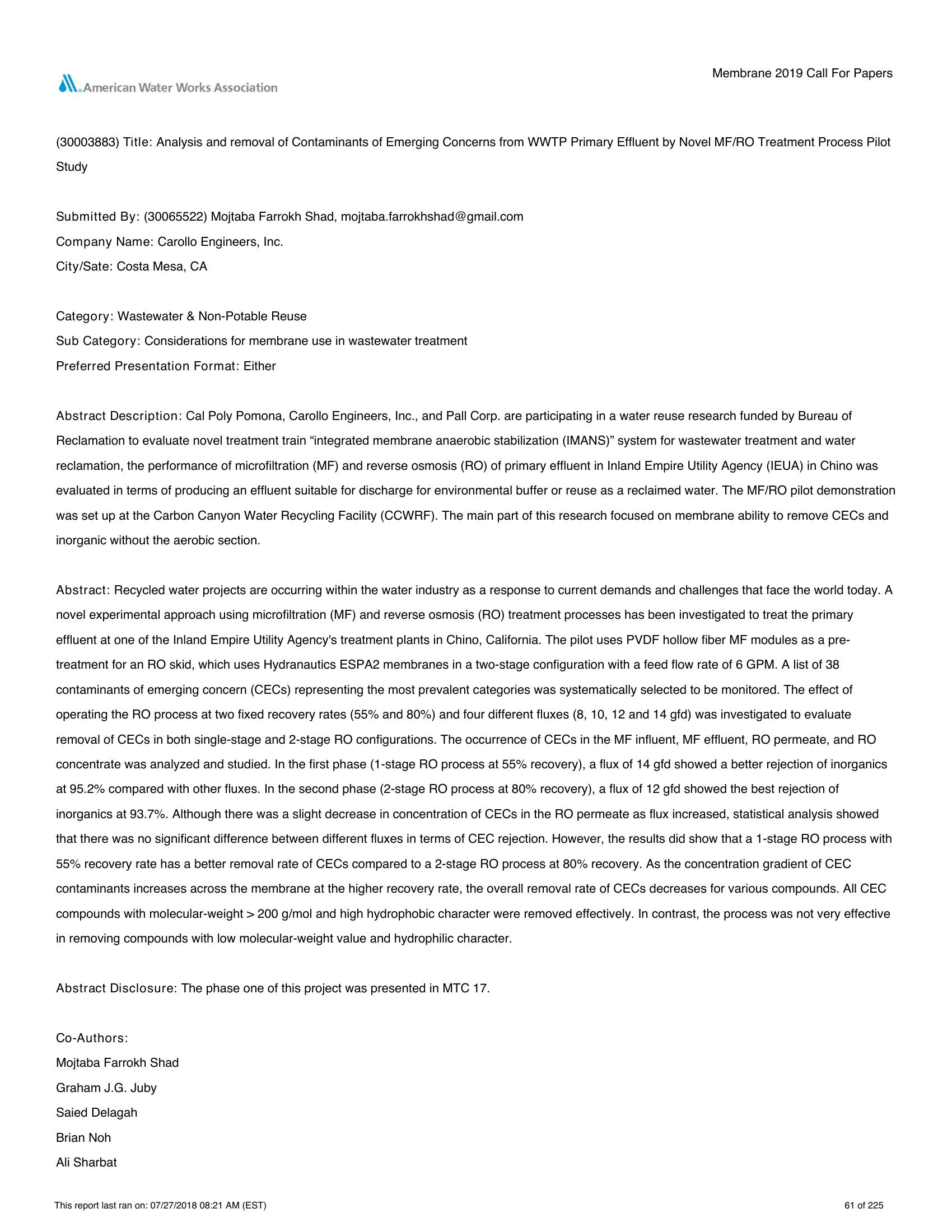 Cal Poly Pomona, Carollo Engineers, Inc., and Pall Corp. are participating in a water reuse research funded by Bureau of Reclamation to evaluate novel treatment train ?integrated membrane anaerobic stabilization (IMANS)? system for wastewater treatment and water reclamation, the performance of microfiltration (MF) and reverse osmosis (RO) of primary effluent in Inland Empire Utility Agency (IEUA) in Chino was evaluated in terms of producing an effluent suitable for discharge for environmental buffer or reuse as a reclaimed water. The MF/RO pilot demonstration