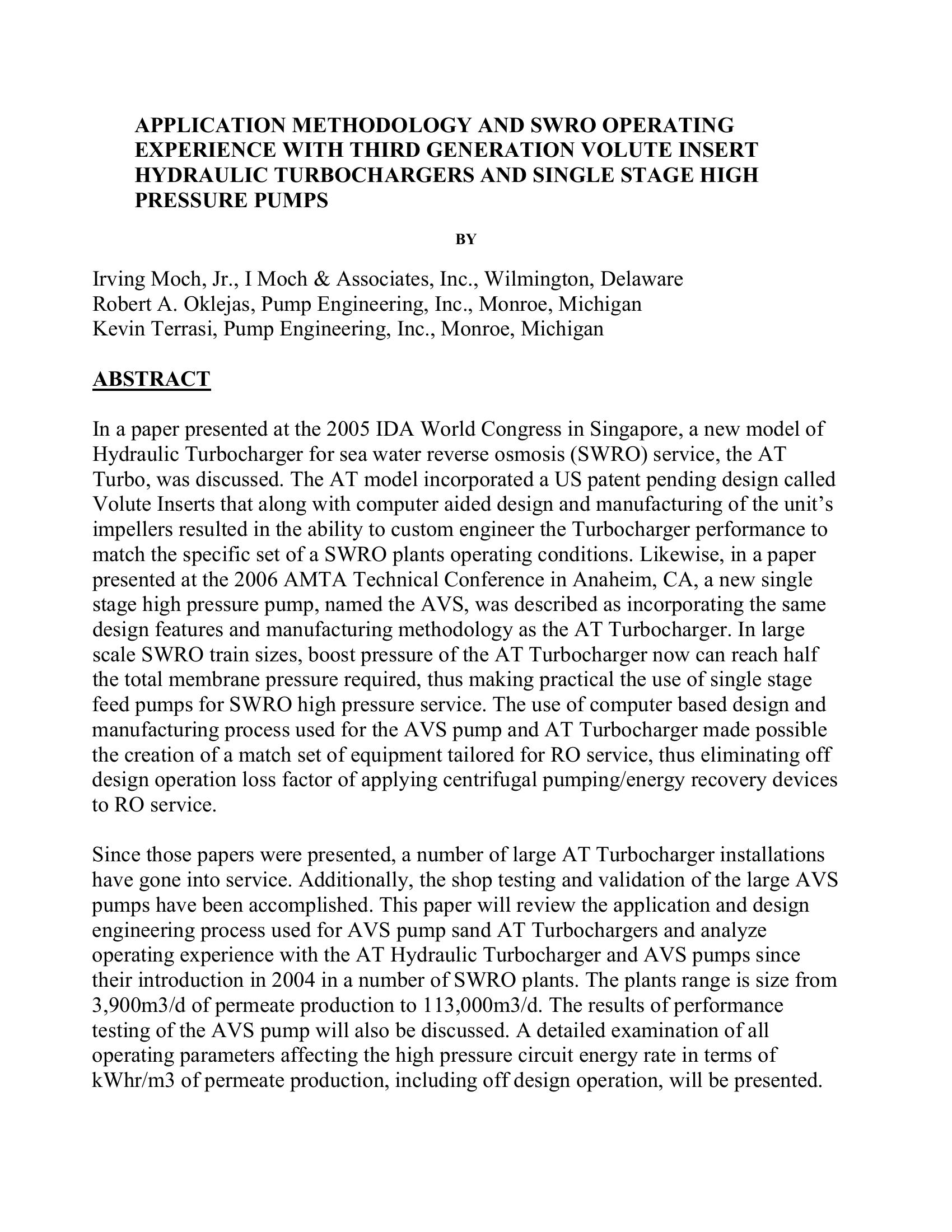 This paper review’s the application and design engineering process used for AVS pumps and AT Turbochargers and analyze operating experience with the AT Hydraulic Turbocharger and AVS pumps since their introduction in 2004 in a number of SWRO plants. The results of performance testing of the AVS pump is also discussed.