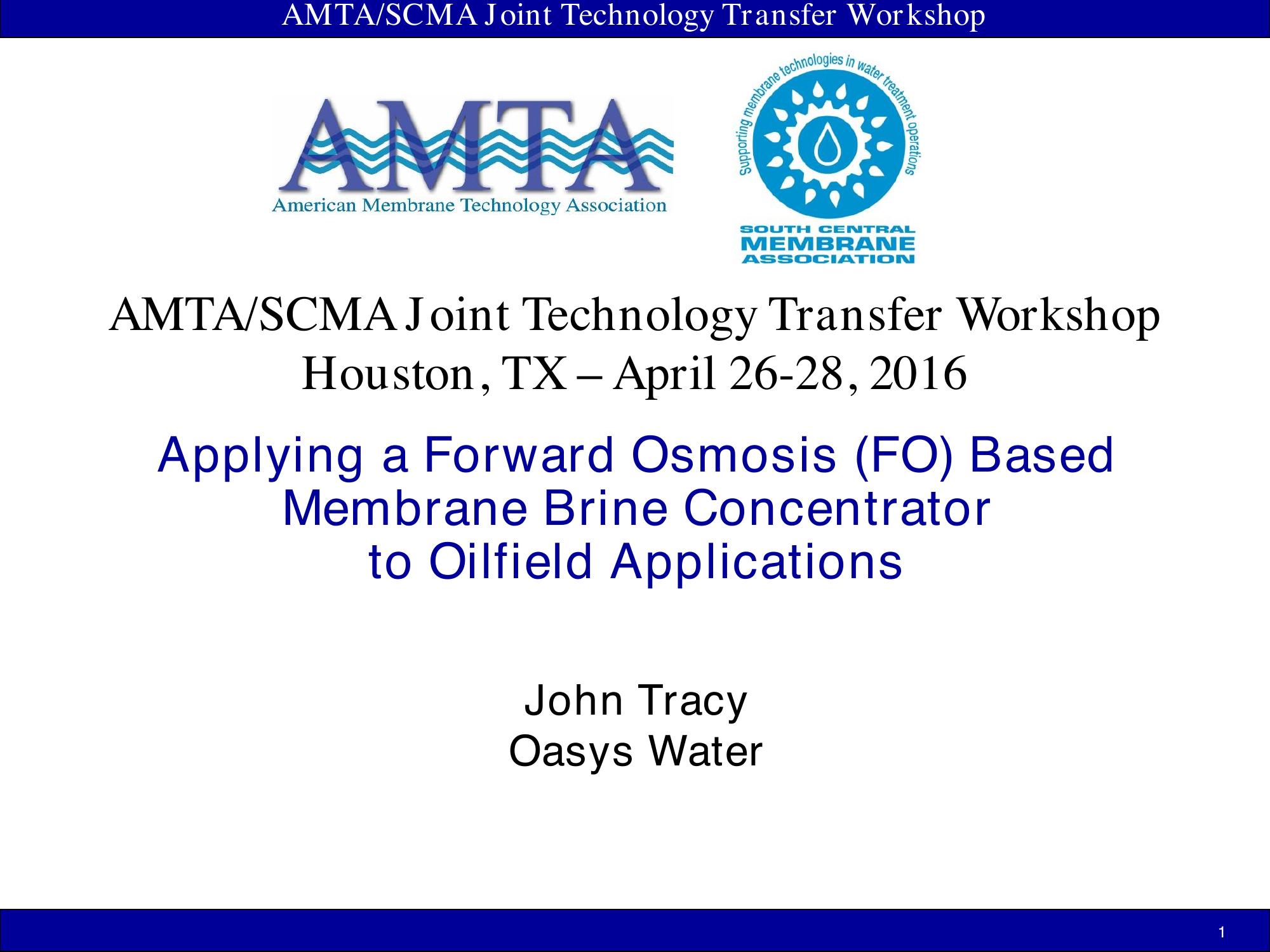 Forward osmosis (FO) is the membrane-based process by which a high osmotic potential stream (i.e., draw solution) is used to capture fresh water from a saline or contaminated feed water. The result is a highly concentrated brine and a diluted draw solution stream. The diluted draw is then processed for reconcentration of the draw species and recovery of the final product water. This technology is well suited to water recovery and reuse in oil and gas extraction applications. In this presentation we will discuss how the Oasys FO technology platform is being applied in a range of industrial markets, with particular focus on operating facilities in two continents.
