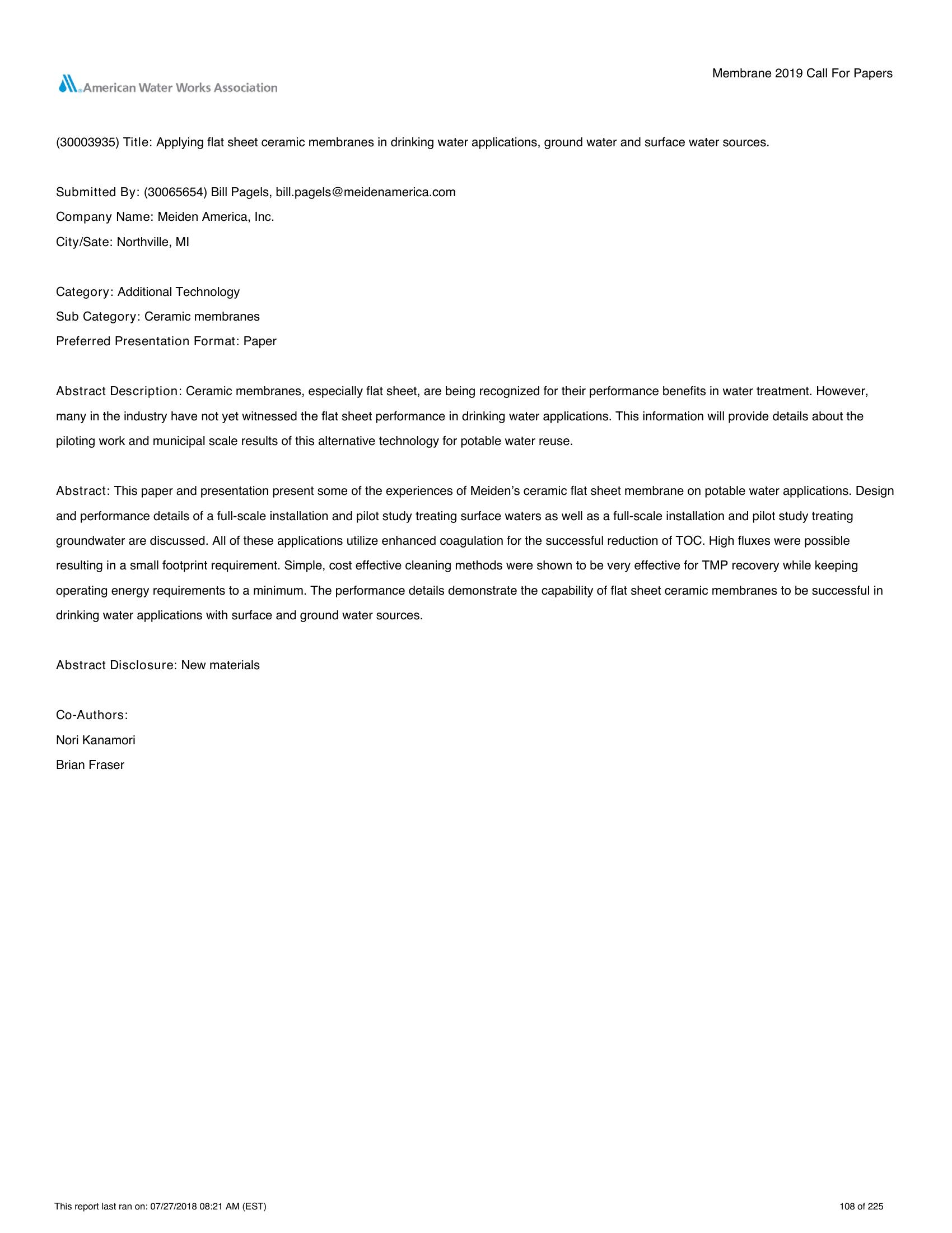 Applying Flat Sheet Ceramic Membranes in Drinking Water Applications, Ground Water and Surface Water Sources