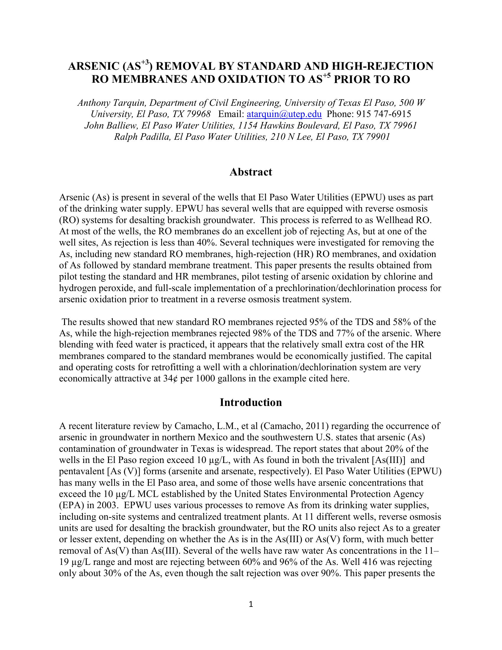 Arsenic (As) is present in several of the wells that El Paso Water Utilities (EPWU) uses as part of the drinking water supply. EPWU has several wells that are equipped with reverse osmosis (RO) systems for desalting brackish groundwater. This process is referred to as Wellhead RO. At most of the wells, the RO membranes do an excellent job of rejecting As, but at one of the well sites, As rejection is less than 40%. Several techniques were investigated for removing the As, including new standard RO membranes, high-rejection (HR) RO membranes, and oxidation of As followed by standard membrane treatment. This paper presents the results obtained from pilot testing the standard and HR membranes, pilot testing of arsenic oxidation by chlorine and hydrogen peroxide, and full-scale implementation of a prechlorination/dechlorination process for arsenic oxidation prior to treatment in a reverse osmosis treatment system.