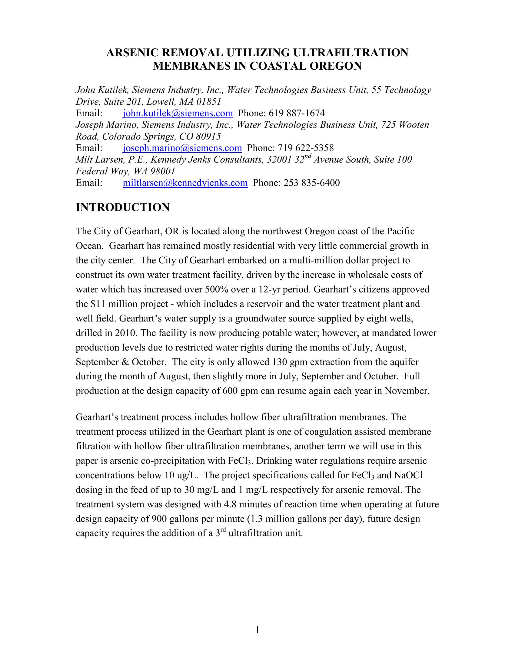 Arsenic Removal with Ultrafiltration in Coastal Oregon