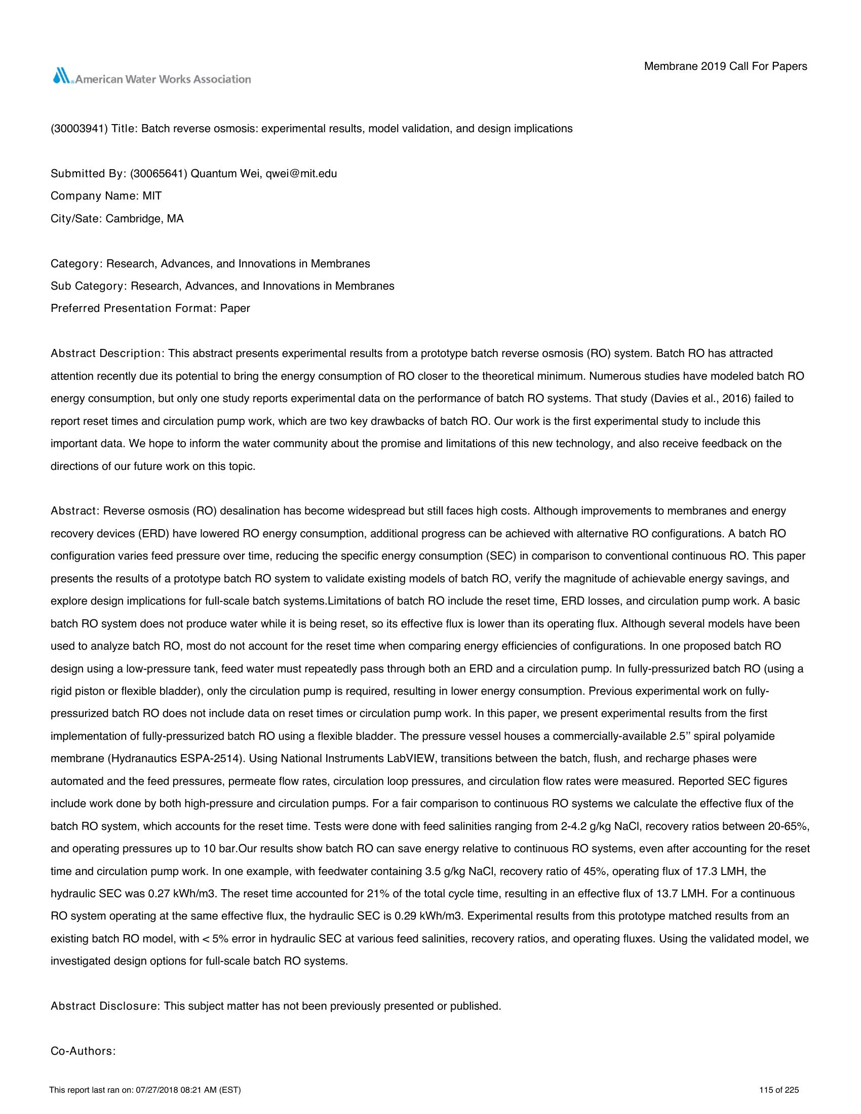 | Keywords | Batch Reverse Osmosis, True Batch, Energy Efficiency |