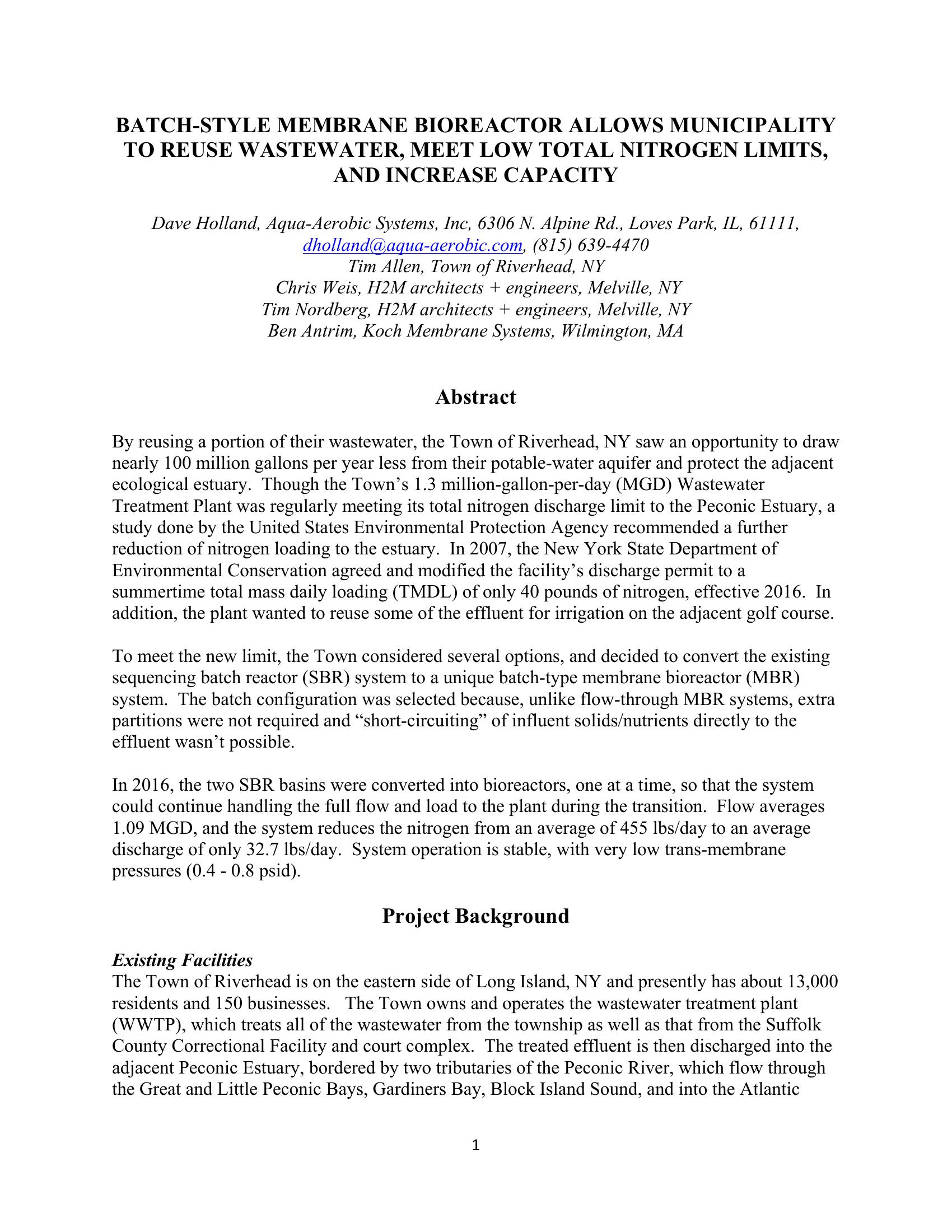This presentation describes how the town of Riverhead, NY, is saving 100 million gallons per year of potable water by reusing its wastewater for landscape irrigation. The existing SBR basins were converted into a unique batch-style membrane bioreactor (MBR) while maintaining capacity and treatment during the upgrade. The design flow increased from 1.4 to 1.6 MGD, the effluent total nitrogen limit decreased from 10 mg/L to 3 mg/L, and the organic and nitrogen loading increased 334% and 250%, respectively. Engineers will learn of a viable method for expanding plant capacity and/or achieving lower nitrogen limits, while plant personnel will learn how such an expansion can be achieved without sacrificing throughput or effluent quality.
