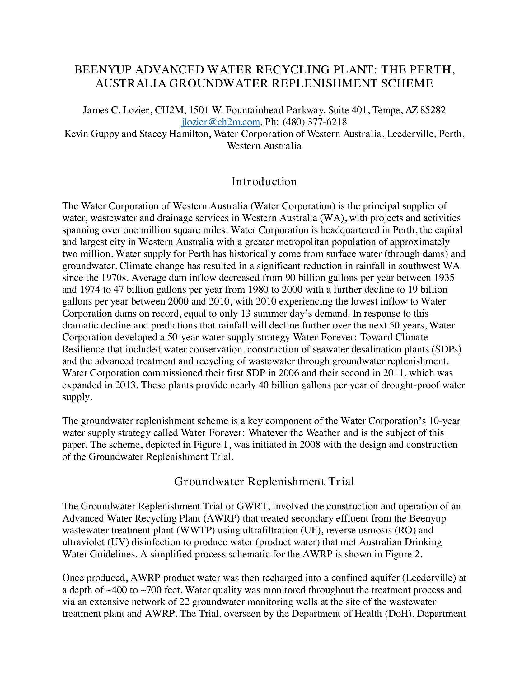 Beenyup Advanced Water Recycling Plant: The Perth, Australia Groundwater Replenishment Scheme