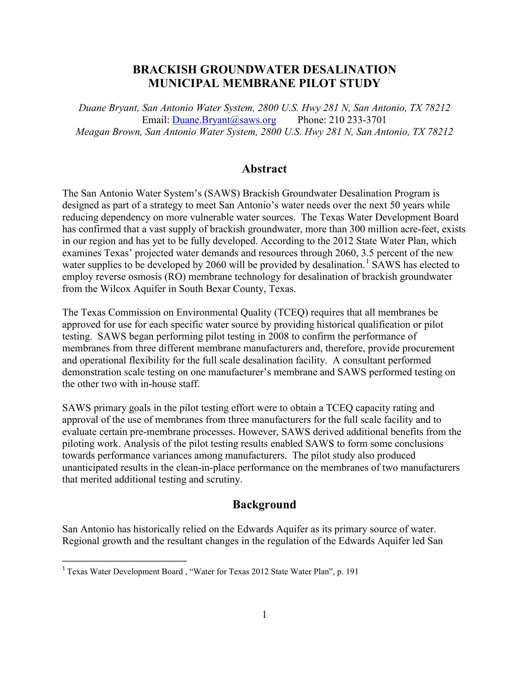 The paper describes the pilot testing for San Antonio Water System?s (SAWS) Brackish Groundwater Desalination Program. The primary goals in the pilot testing effort were to obtain a TCEQ capacity rating and approval of the use of membranes from three manufacturers for the full scale facility and to evaluate certain pre-membrane processes. However, SAWS derived additional benefits from the piloting work. Analysis of the pilot testing results enabled SAWS to form some conclusions towards performance variances among manufacturers. The pilot study also produced unanticipated results in the clean-in-place performance on the membranes of two manufacturers that merited additional testing and scrutiny.