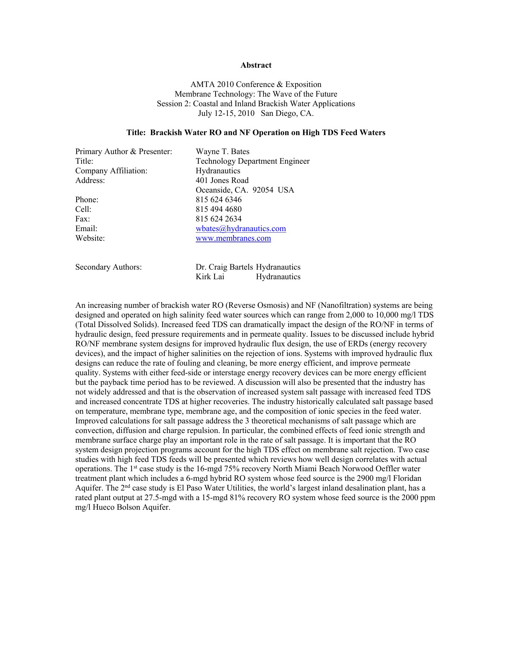 An increasing number of brackish water RO (Reverse Osmosis) and NF (Nanofiltration) systems are being designed and operated on high salinity feed water sources which can range from 2,000 to 10,000 mg/l TDS (Total Dissolved Solids). Increased feed TDS can dramatically impact the design of the RO/NF in terms of hydraulic design, feed pressure requirements and in permeate quality. Two case studies with high feed TDS feeds are described in detail, including how well design correlates with actual operations. The 1st case study is the 16-mgd 75% recovery North Miami Beach Norwood Oeffler water treatment plant which includes a 6-mgd hybrid RO system whose feed source is the 2900 mg/l Floridan Aquifer. The 2nd case study is El Paso Water Utilities, the world’s largest inland desalination plant, has a rated plant output at 27.5-mgd with a 15-mgd 81% recovery RO system whose feed source is the 2000 ppm mg/l Hueco Bolson Aquifer. Hybrid RO and NF systems which can use a number of different membrane types can be used to roduce the most energy efficient systems, can produce the best permeate quality, and can improve system flux distribution that may reduce the rate of fouling. The use of turbine-type energy recovery devices in a esign can improve the energy efficiency, improve permeate quality, and improve flux distribution and reduce the rate of fouling.