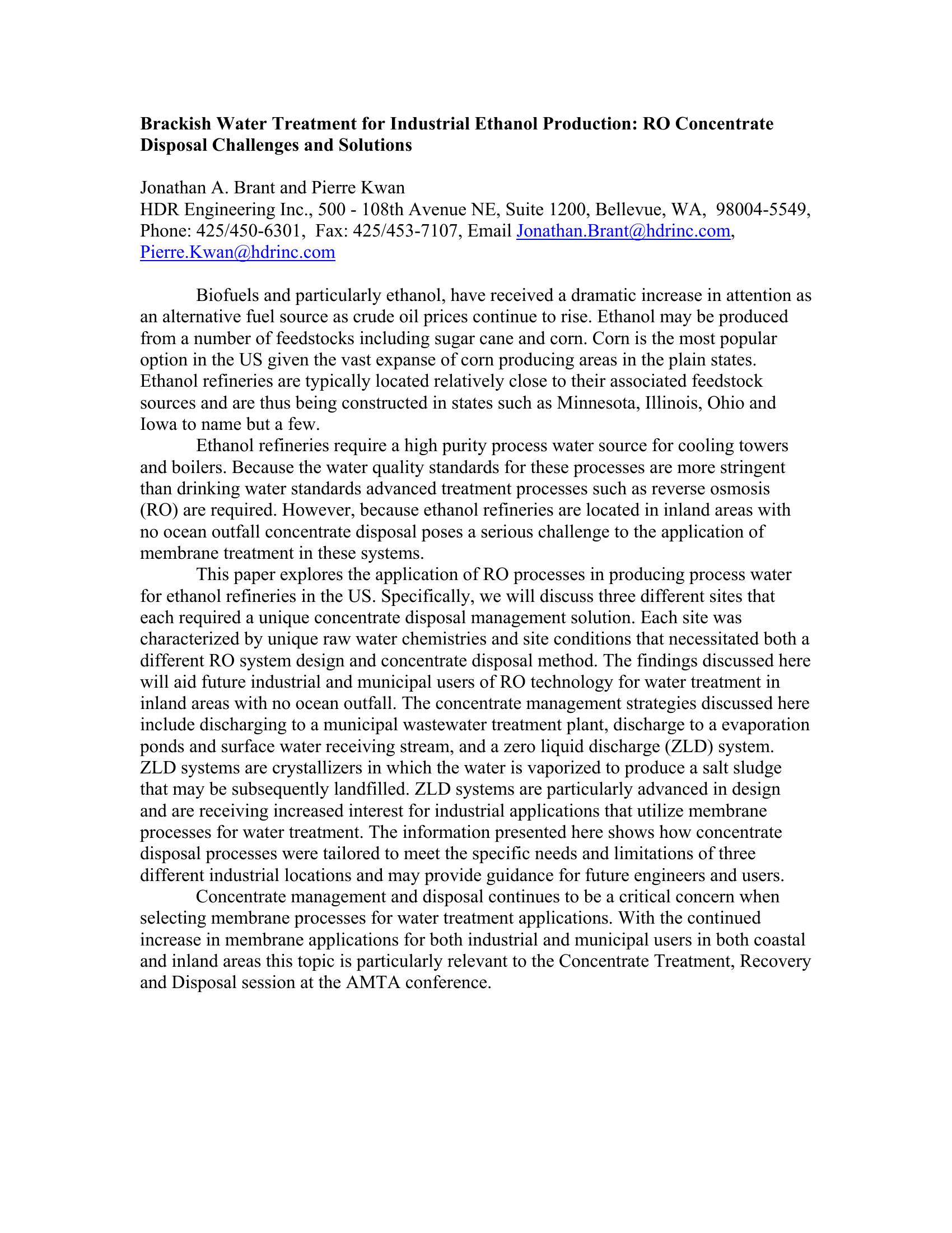 Brackish Water Treatment for Industrial Ethanol Production: RO Concentrate Disposal Challenges and Solutions