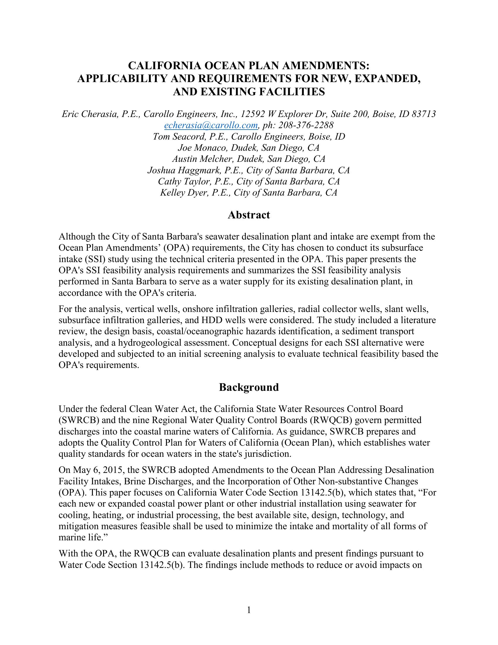 Although the City of Santa Barbara’s seawater desalination plant and intake are exempt from the Ocean Plan Amendments’ (OPA) requirements, the City has chosen to conduct its subsurface intake (SSI) study using the technical criteria presented in the OPA. This paper presents the OPA’s SSI feasibility analysis requirements and summarizes the SSI feasibility analysis performed in Santa Barbara to serve as a water supply for its existing desalination plant, in accordance with the OPA’s criteria. For the analysis, vertical wells, onshore infiltration galleries, radial collector wells, slant wells, subsurface infiltration galleries, and HDD wells were considered. The study included a literature review, the design basis, coastal/oceanographic hazards identification, a sediment transport analysis, and a hydrogeological assessment. Conceptual designs for each SSI alternative were developed and subjected to an initial screening analysis to evaluate technical feasibility based the OPA’s requirements.
