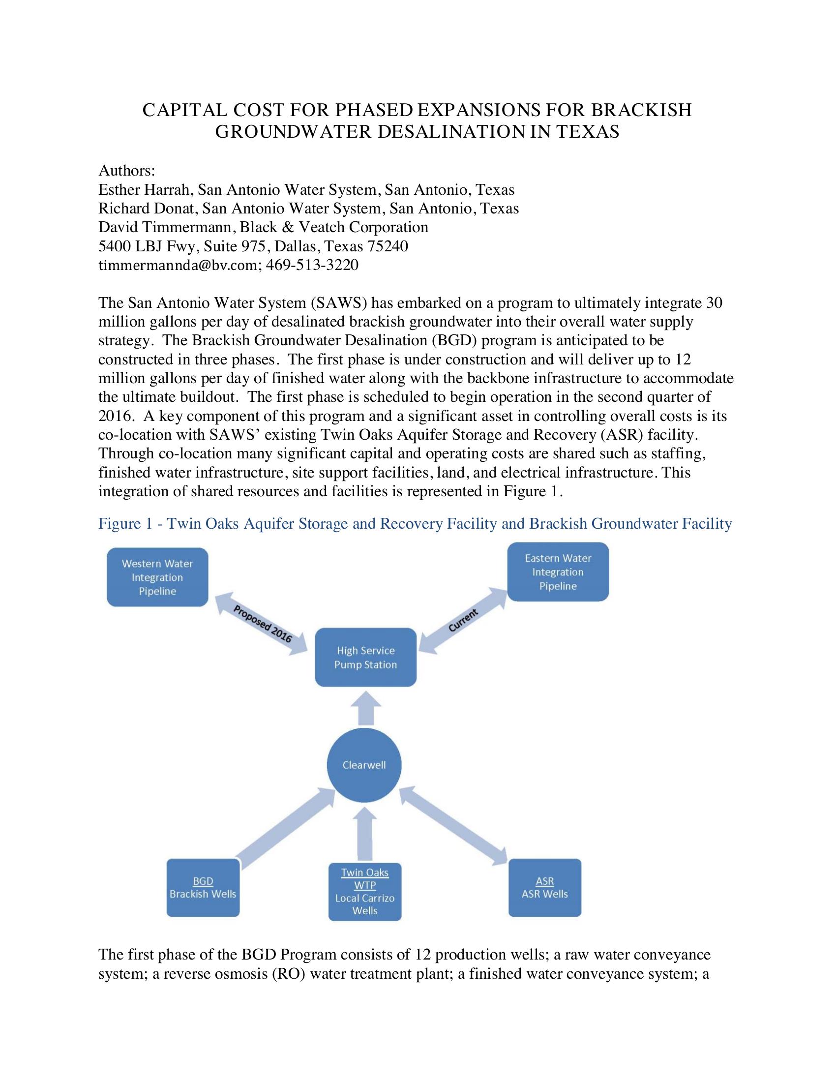 This paper presents the capitol cost for a phased expansion for the San Antonio Water Systems ( SAWS) program to integrate 30 million gallons per day of desalinated brackish groundwater into their overall water supply strategy. The Brackish Groundwater Desalination (BGD) program is anticipated to be constructed in three phases. Phase one will deliver up to 12 million gallons per day of finished water along with the backbone infrastructure to accommodate the ultimate buildout. Coordination with SAWS? Twin Oaks Aquifer Storage and Recovery (ASR) facility will be done.