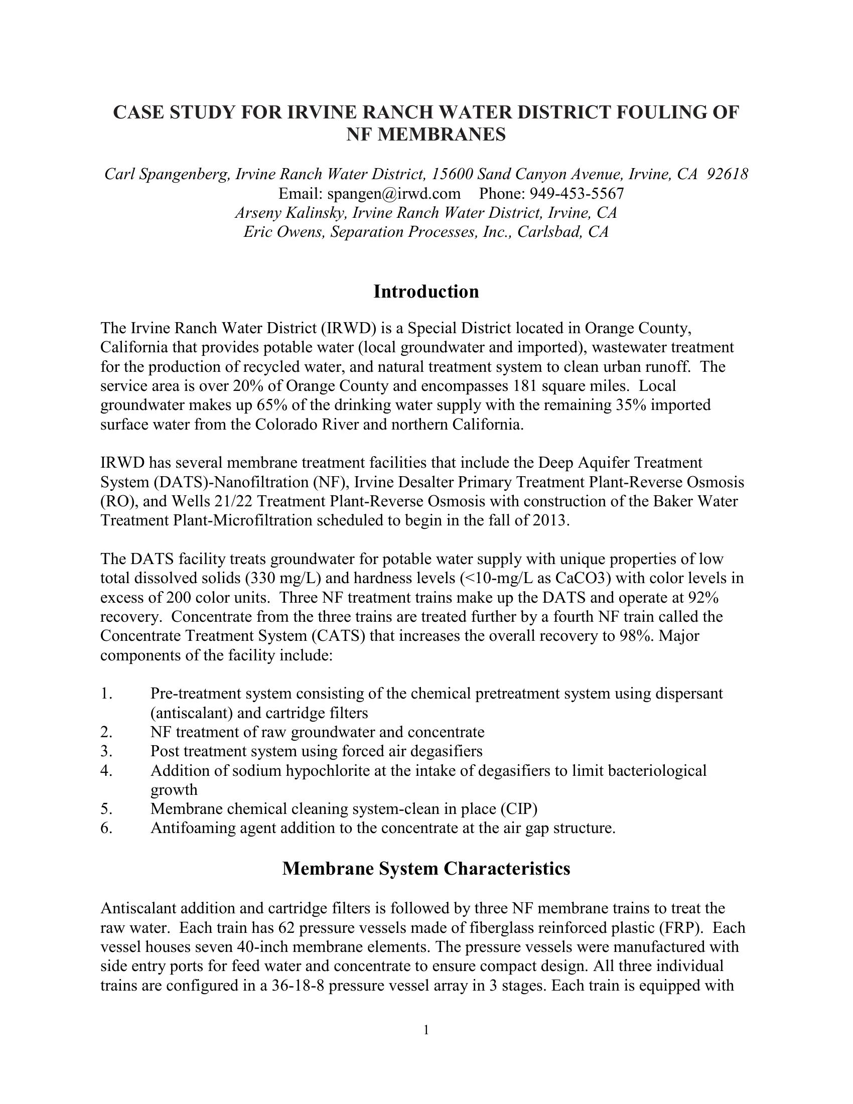 Case Study for Irvine Ranch Water District – Fouling of NF Membranes