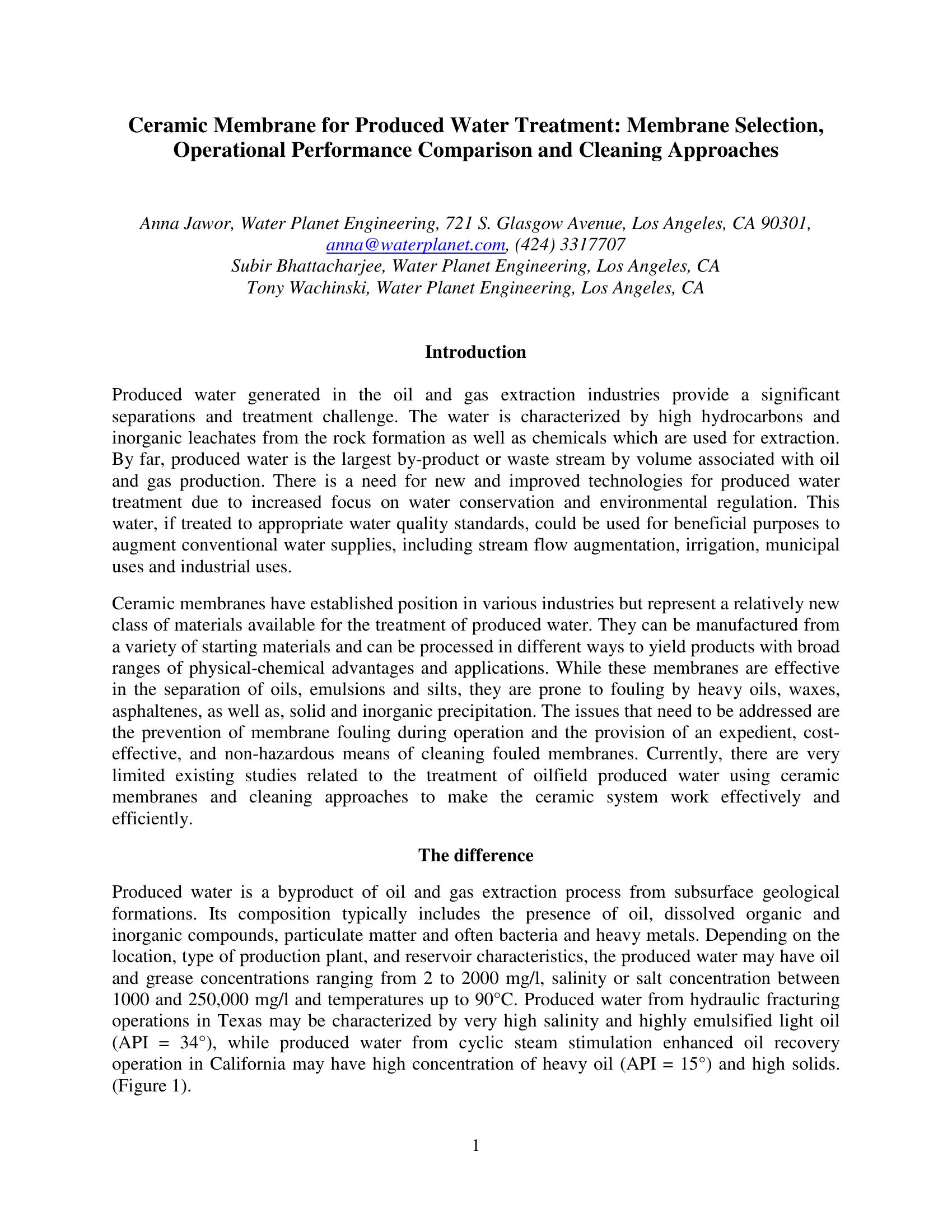 This paper describes the use of ceramic membrane for produced water treatment and discusses membrane selection, operational performance comparison and cleaning approaches