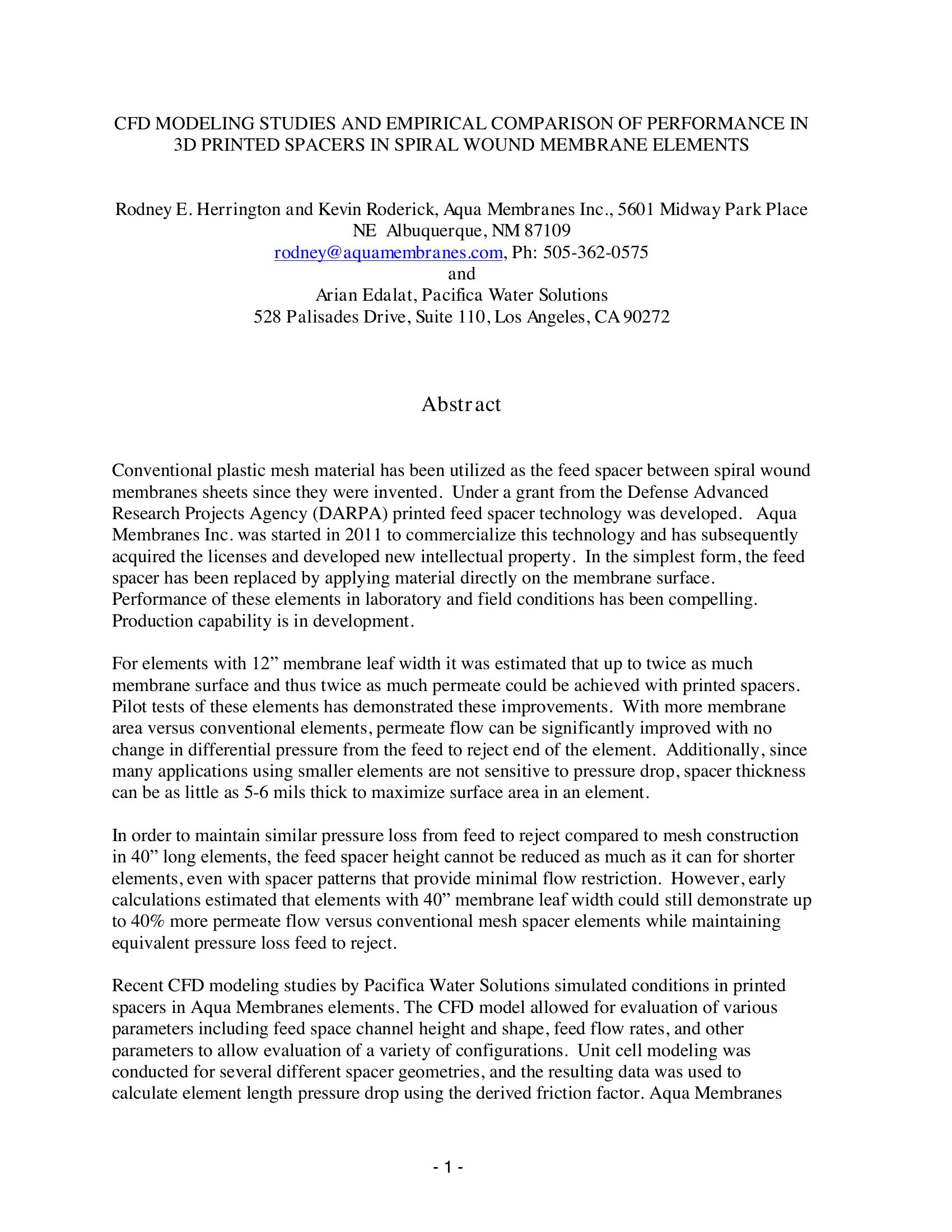 Conventional plastic mesh material has been utilized as the feed spacer between spiral wound membranes sheets since they were invented. Under a grant from the Defense Advanced Research Projects Agency (DARPA) printed feed spacer technology was developed. Aqua Membranes Inc. was started in 2011 to commercialize this technology and has subsequently acquired the licenses and developed new intellectual property. In the simplest form, the feed spacer has been replaced by applying material directly on the membrane surface. Performance of these elements in laboratory and field conditions has been compelling. Production capability is in development. For elements with 12î membrane leaf width it was estimated that up to twice as much membrane surface and thus twice as much permeate could be achieved with printed spacers. Pilot tests of these elements has demonstrated these improvements. With more membrane area versus conventional elements, permeate flow can be significantly improved with no change in differential pressure from the feed to reject end of the element. Additionally, since many applications using smaller elements are not sensitive to pressure drop, spacer thickness can be as little as 5-6 mils thick to maximize surface area in an element. In order to maintain similar pressure loss from feed to reject compared to mesh construction in 40î long elements, the feed spacer height cannot be reduced as much as it can for shorter elements, even with spacer patterns that provide minimal flow restriction. However, early calculations estimated that elements with 40î membrane leaf width could still demonstrate up to 40% more permeate flow versus conventional mesh spacer elements while maintaining equivalent pressure loss feed to reject.