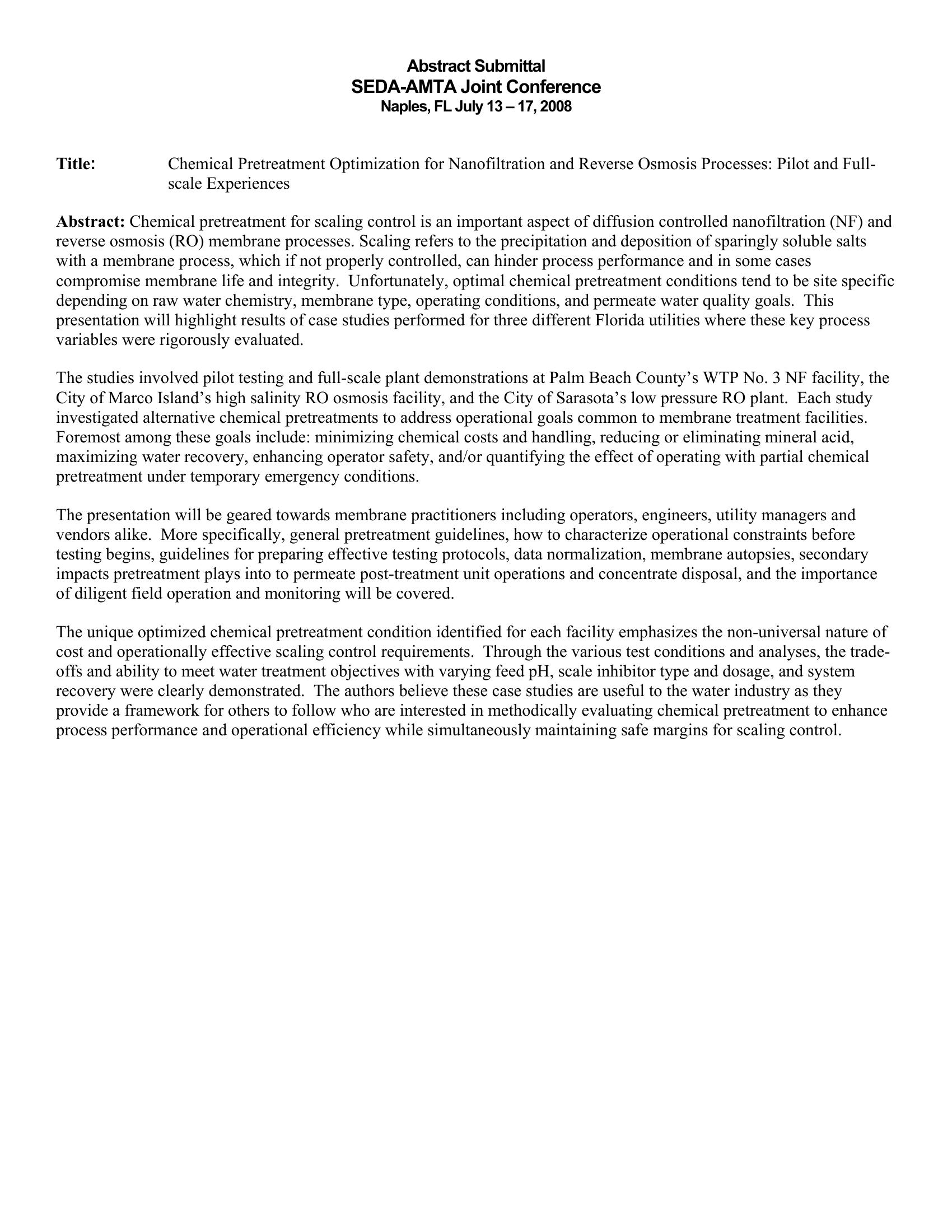 Chemical Pretreatment Optimization for NF and RO Processes: Pilot and Full-Scale Experiences