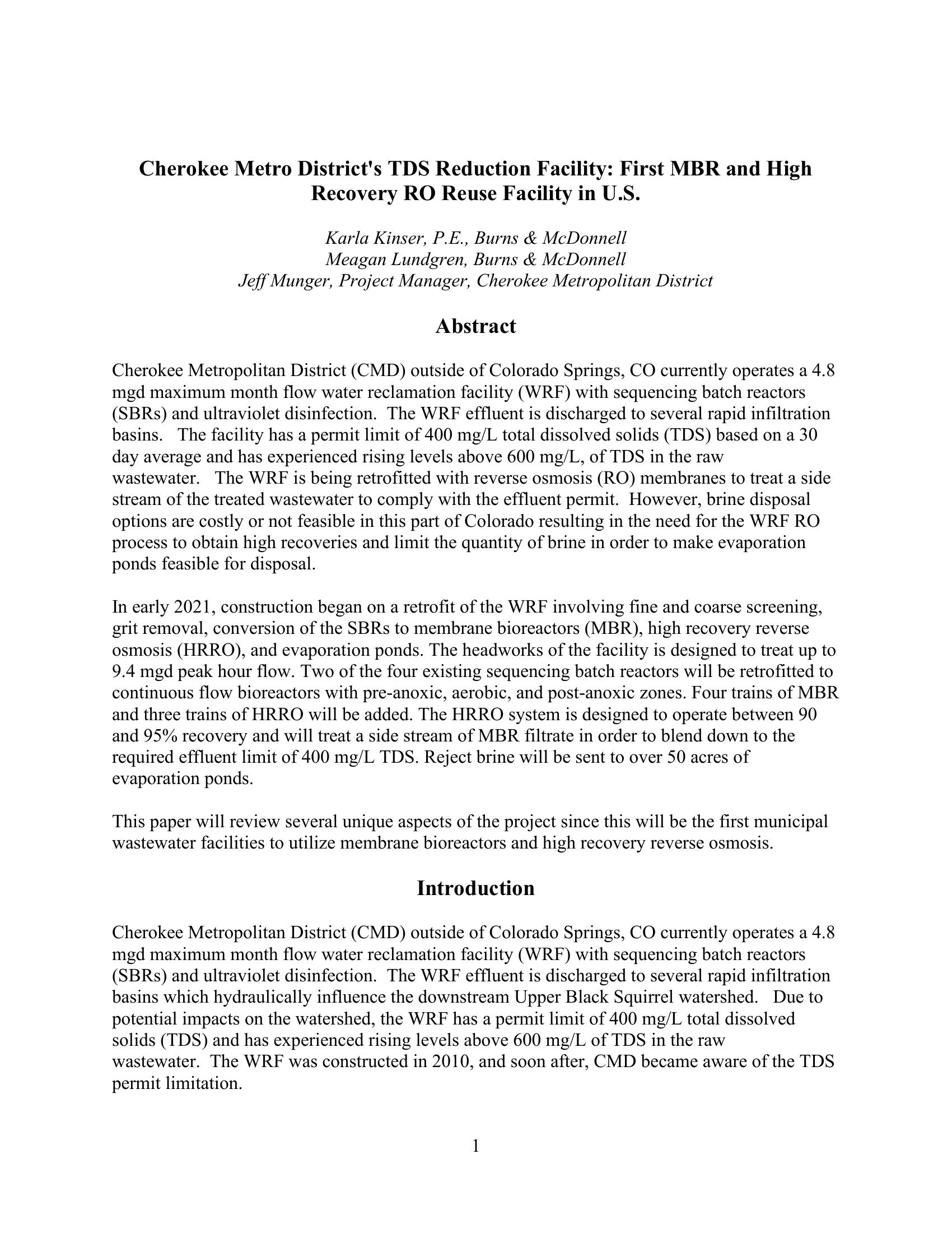 Cherokee Metro District’s TDS Reduction Facility: First MBR and High Recovery RO Reuse Facility in U.S.