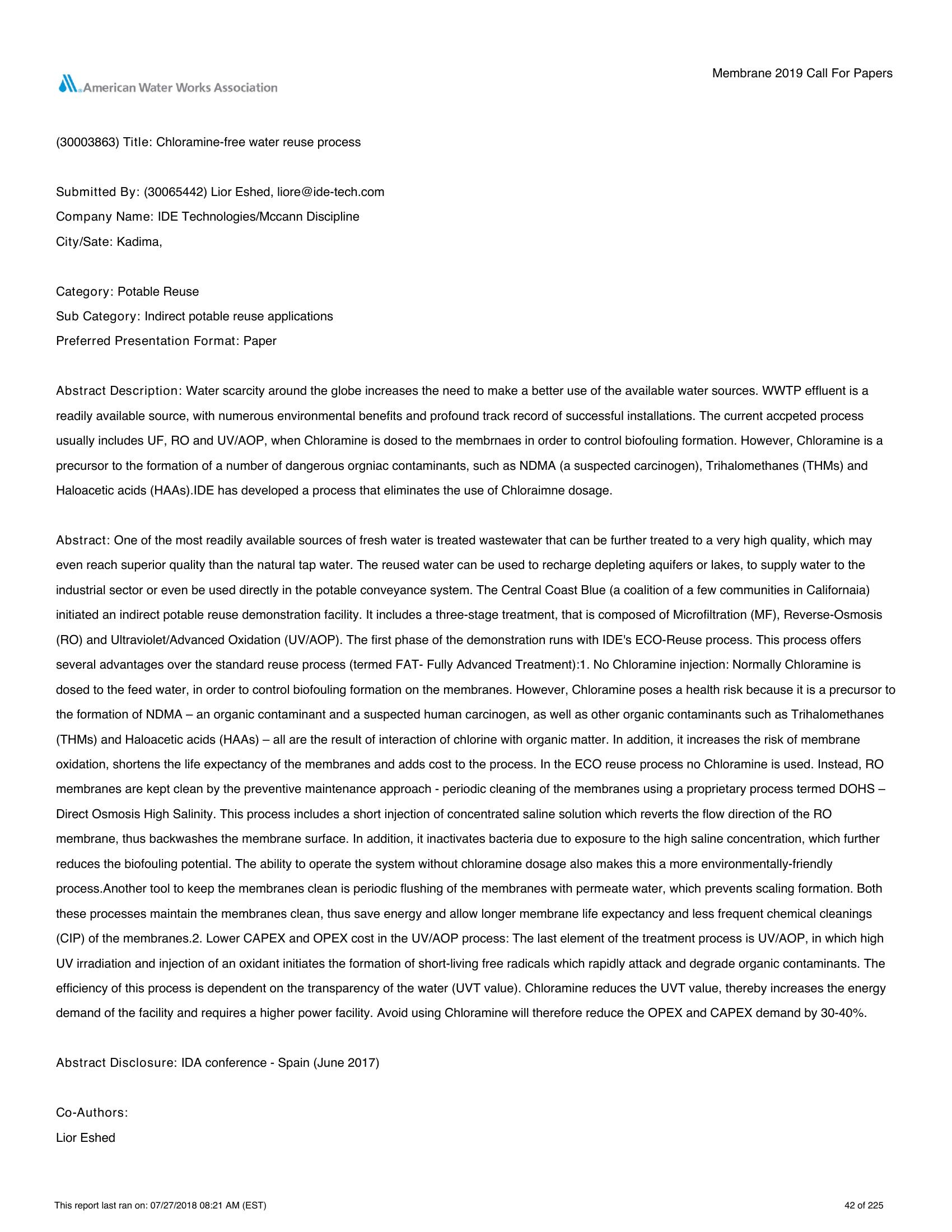 | Keywords | Water Reuse, Chloramine Free, NDMA Free |