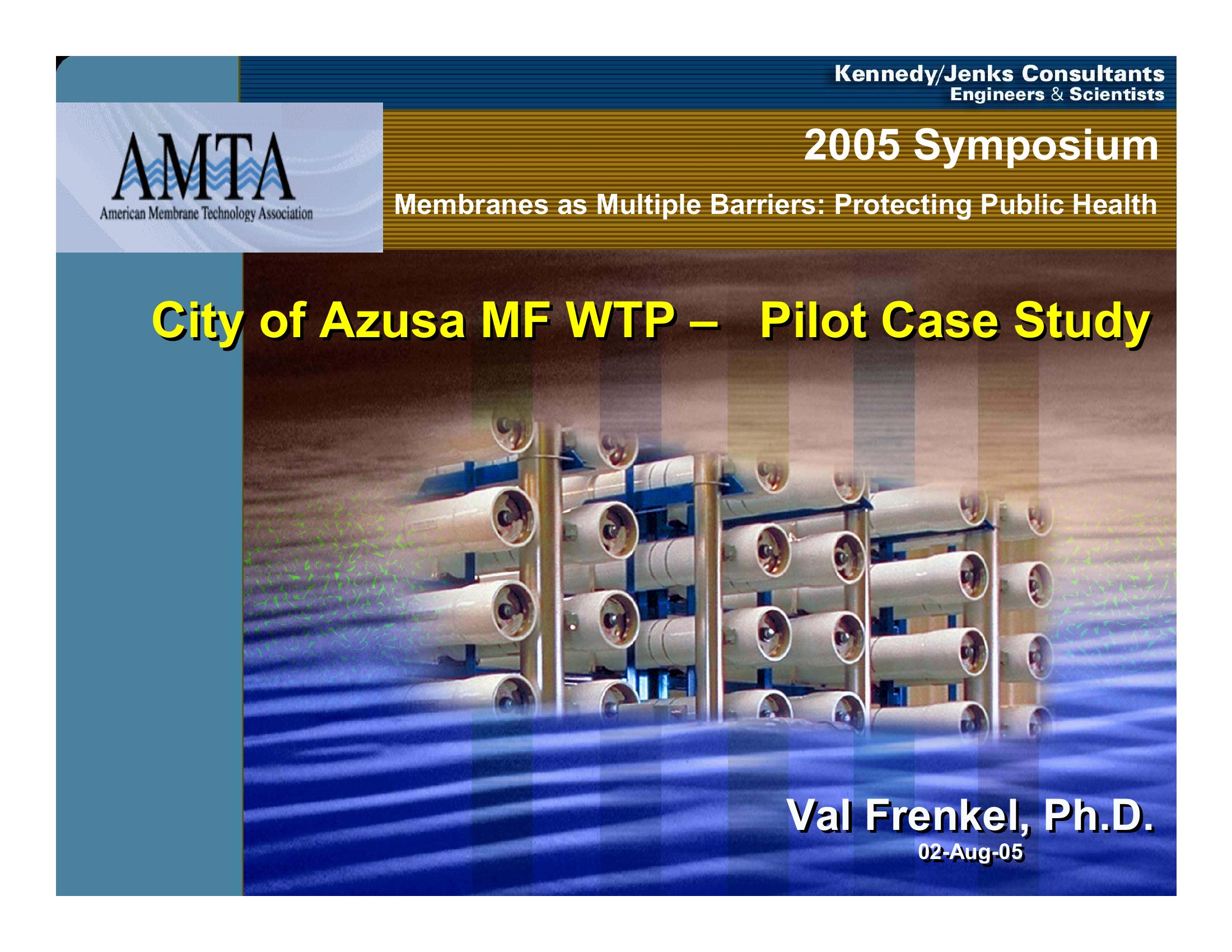 This presentation discusses the pilot study results for the Canyon water treatment plant in the city of Azusa CA. Also discussed is membrane basics, evaluation and water properties. In the actual case study the reader is walked through the decision making process including several side by side pilot tests. Results are then compared looking closely at pathogen removal credits.