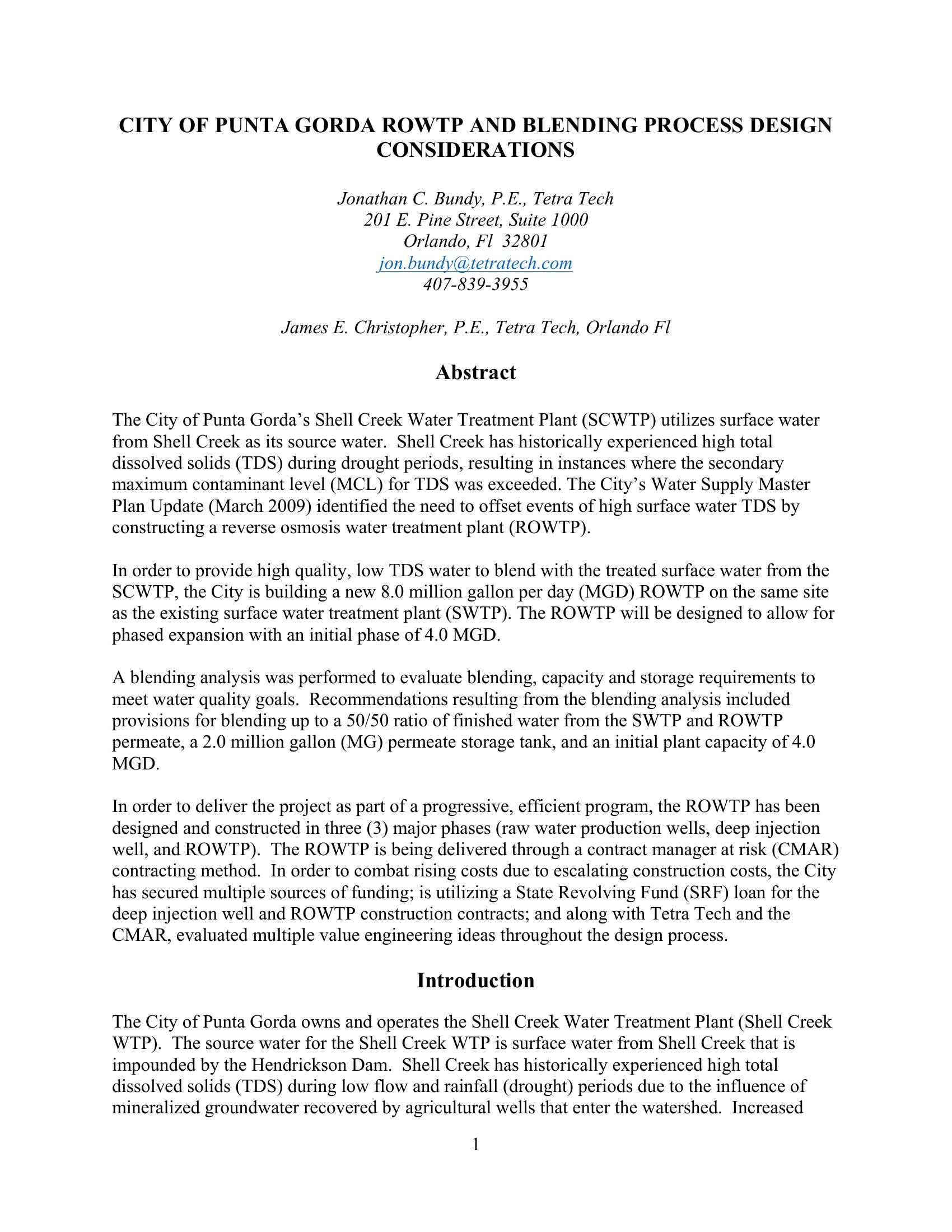 City of Punta Gorda ROWTP and Blending Process Design Considerations