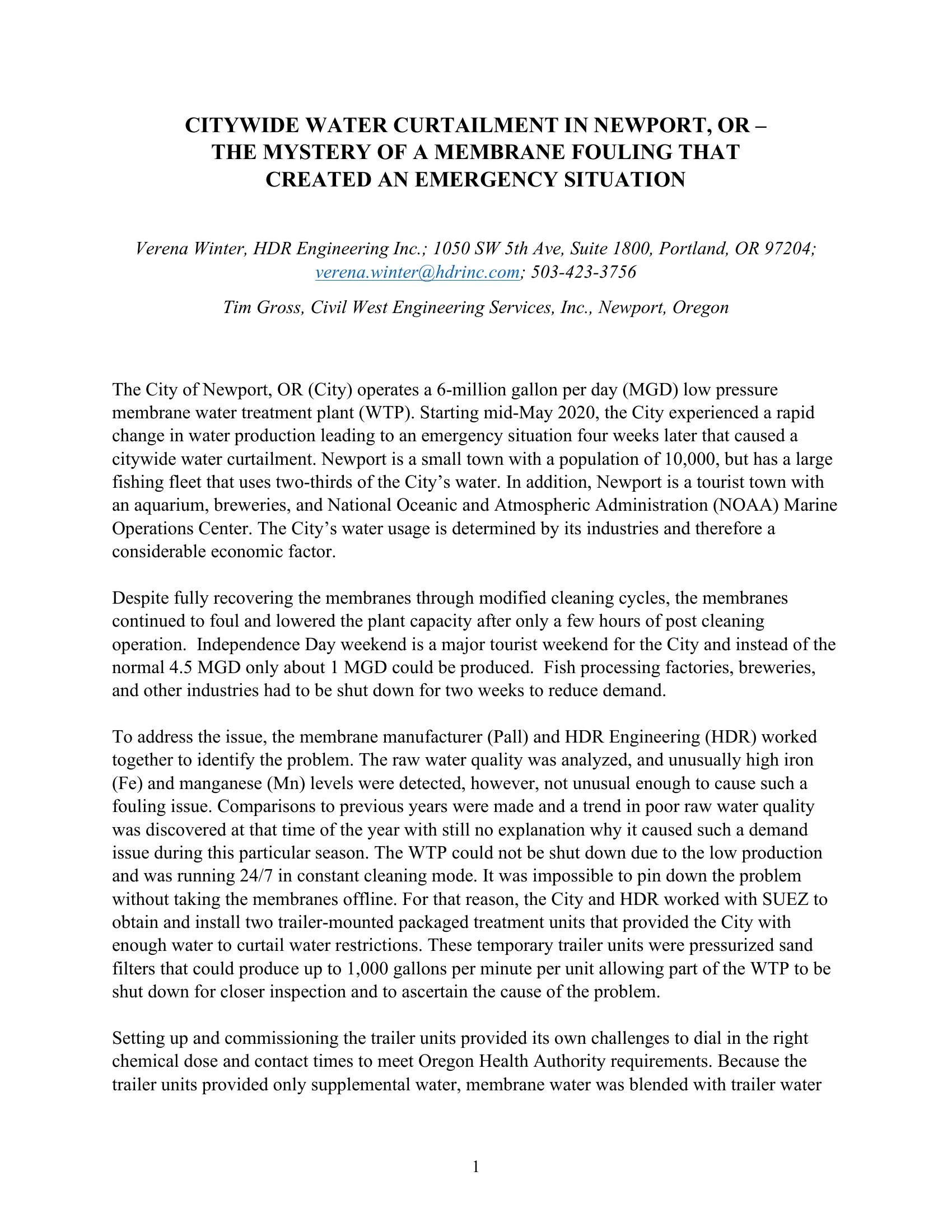 Citywide Water Curtailment in Newport, OR – The Mystery of a Membrane Fouling That Created an Emergency Situation