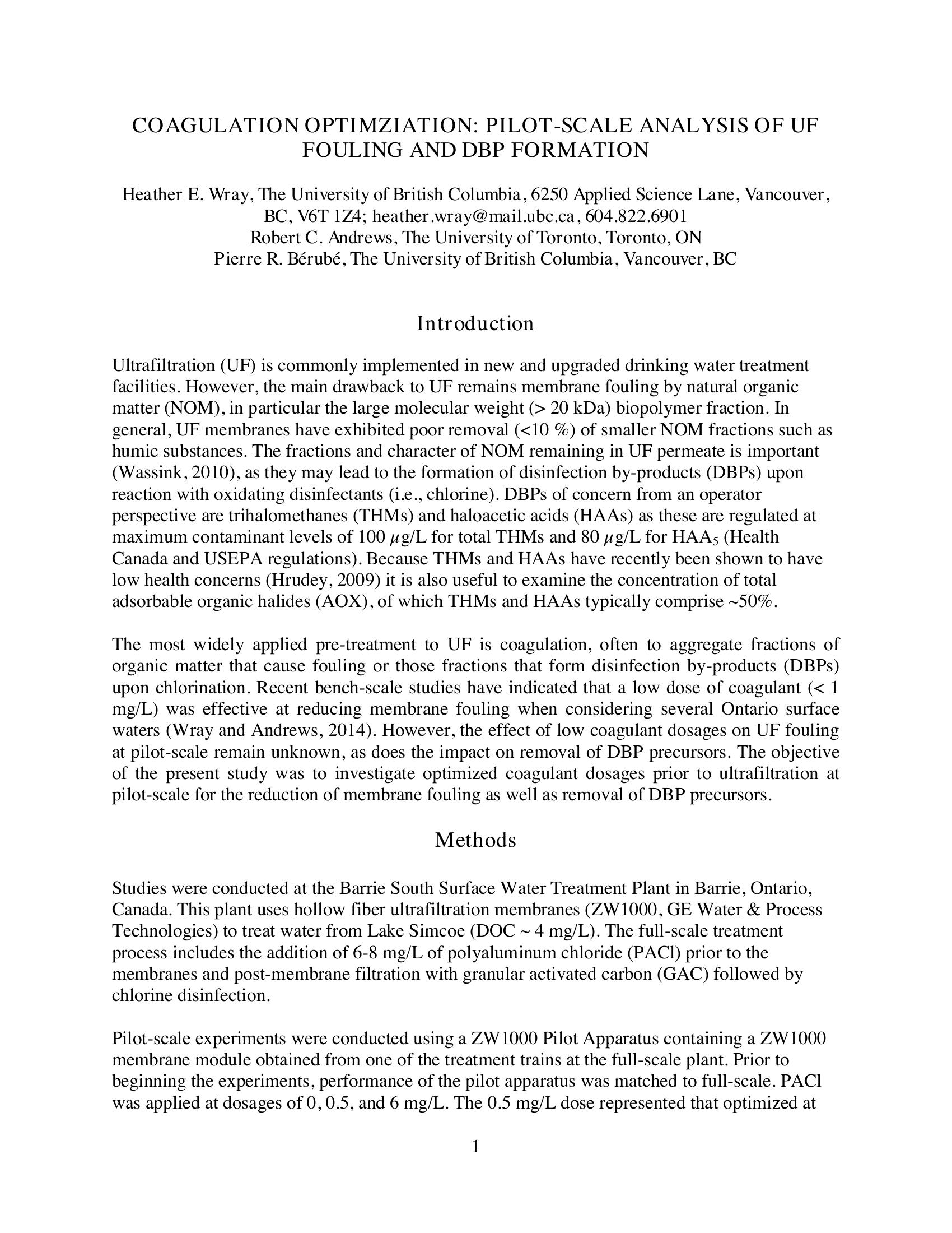 | Keywords | Coagulation, Natural Organic Matter (NOM), Barrie South Surface Water Treatment Plant |